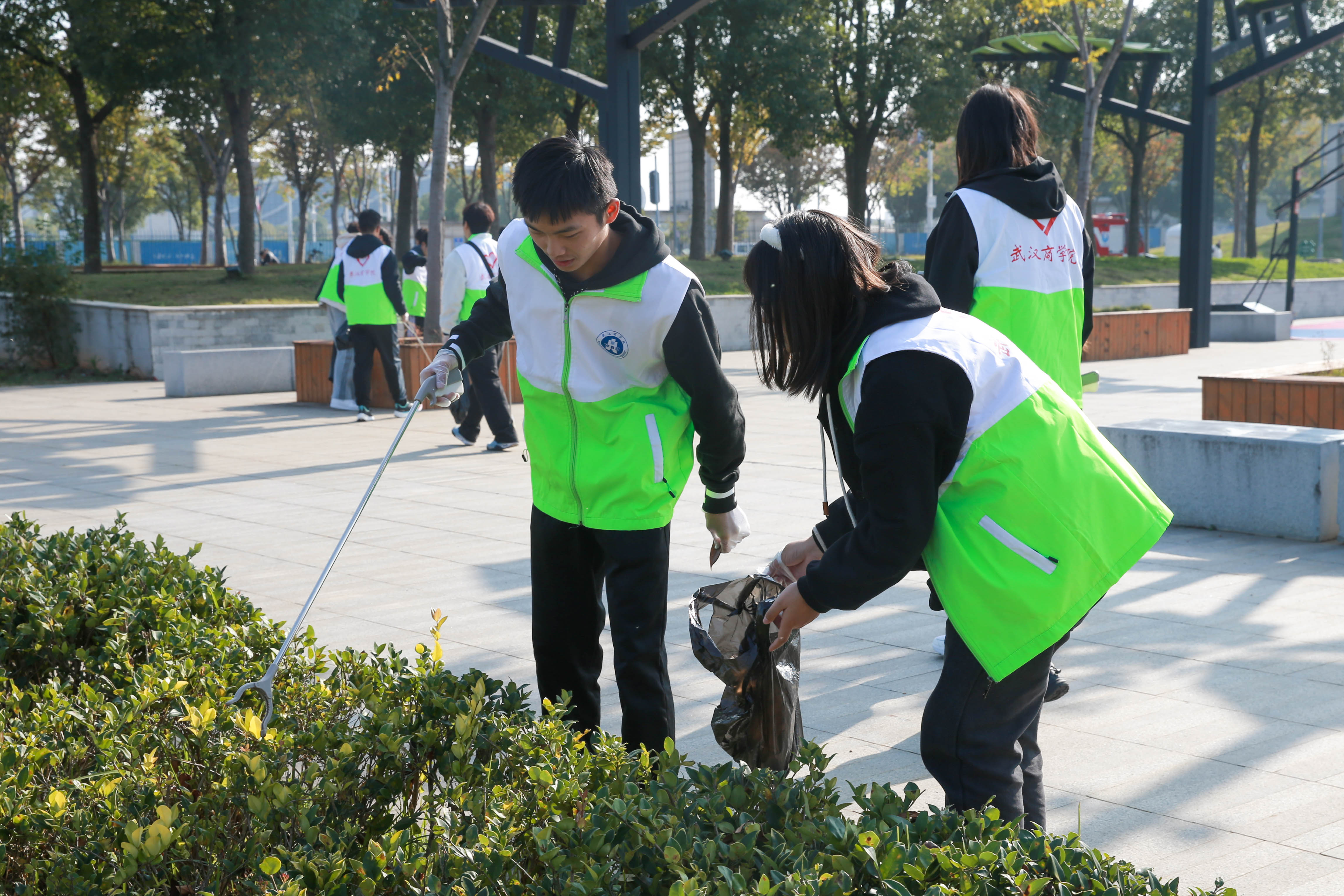 天气虽寒冷,活动正热烈进行着。负责人员向大家讲述了后官湖古树的种类和故事。“据估计现存植物大约有35万种之多。而后官湖有着国槐、柞木、樟树、杜仲、朴树、枣树等14种古树。”负责人靳雨戈担当起了讲解员。听完古树的故事,同学们对于看着古树倍感亲切,纷纷拿起准备好的工具为古树进行垃圾清理。“大家在途中也可以拾起自己喜欢的落叶,然后到明天的活动给大家提供工具用落叶做书签。”负责人发起倡议。他们分散到不超过栅栏的绿道四周寻找白色垃圾,再装入统一的垃圾袋。在大家的配合与协作下,后官湖绿道增添了一抹新的“绿马甲”风景线。