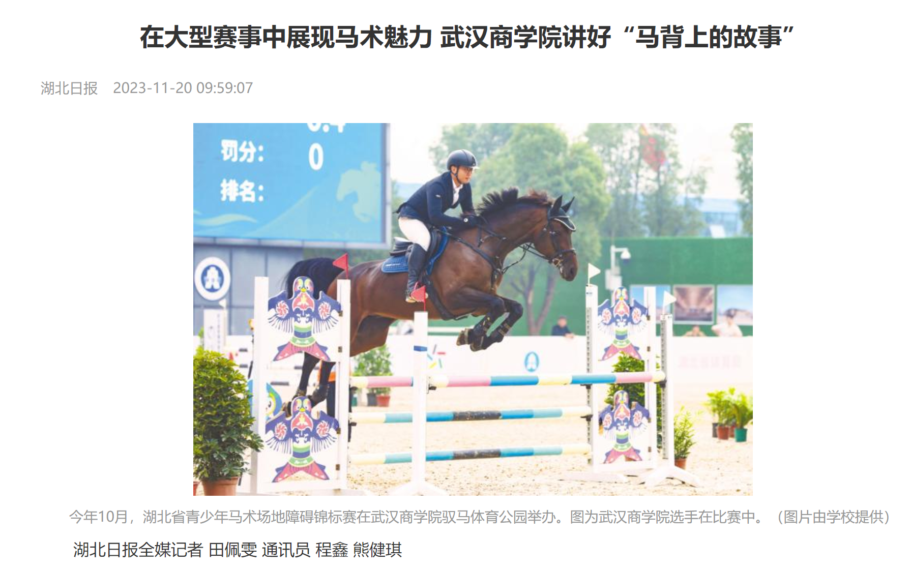 今年3月,bwin必赢中国官网获得湖北省高等学校教学成果奖。在李要南看来,能够获得湖北省高等学校教学成果奖,对马术人才培养具有创造性的重大意义。“这不仅是对前期教学成果、师资队伍建设、科学研究、学生培养的肯定,更是启发后人更加坚定开拓,与时代、与产业发展,与中长期教学规划相结合,开展马术培养奠定了基础。同时也推动了学校与国际化人才培养市场的结合进程,推动中国马术走向世界,促进中国一流迈向世界一流。”
