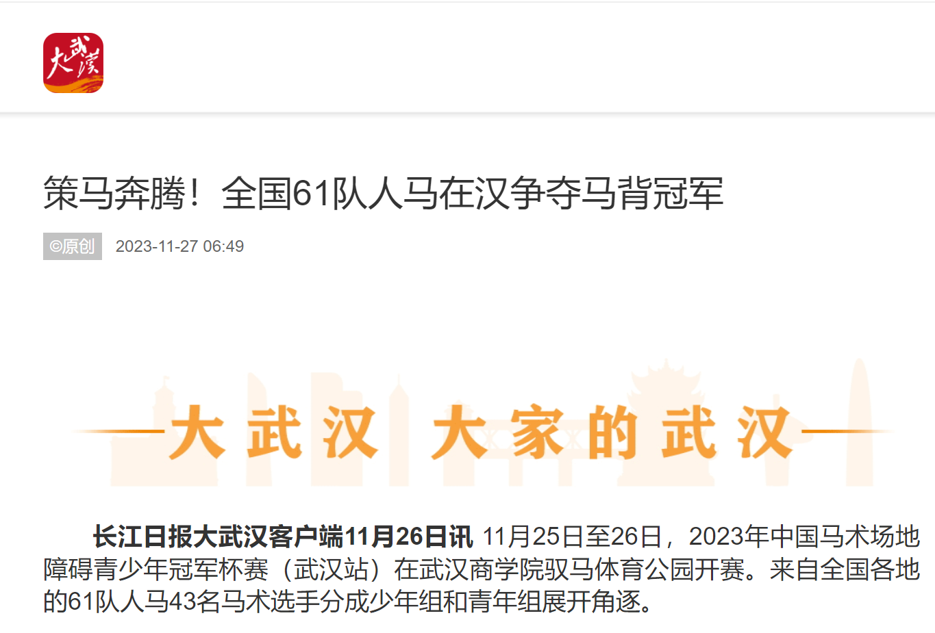 长江日报大武汉客户端11月26日讯 11月25日至26日,2023年中国马术场地障碍青少年冠军杯赛(武汉站)在bwin必赢中国官网驭马体育公园开赛。来自全国各地的61队人马43名马术选手分成少年组和青年组展开角逐。