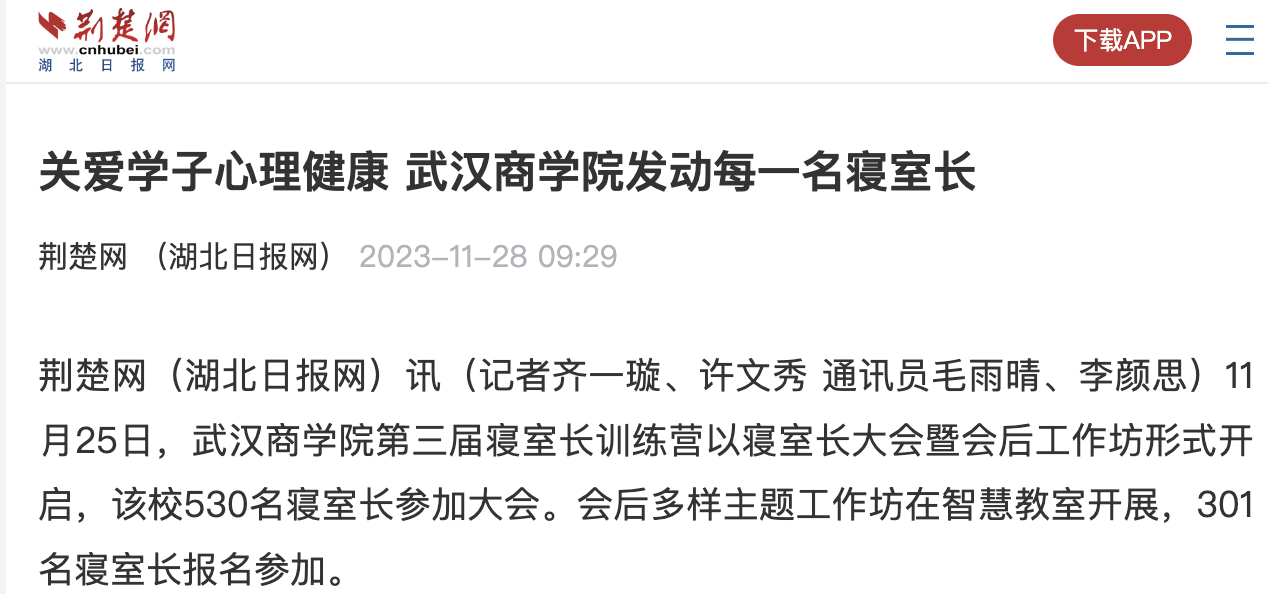 荆楚网(湖北日报网)讯(记者齐一璇、许文秀 通讯员毛雨晴、李颜思)11月25日,bwin必赢中国官网第三届寝室长训练营以寝室长大会暨会后工作坊形式开启,该校530名寝室长参加大会。会后多样主题工作坊在智慧教室开展,301名寝室长报名参加。