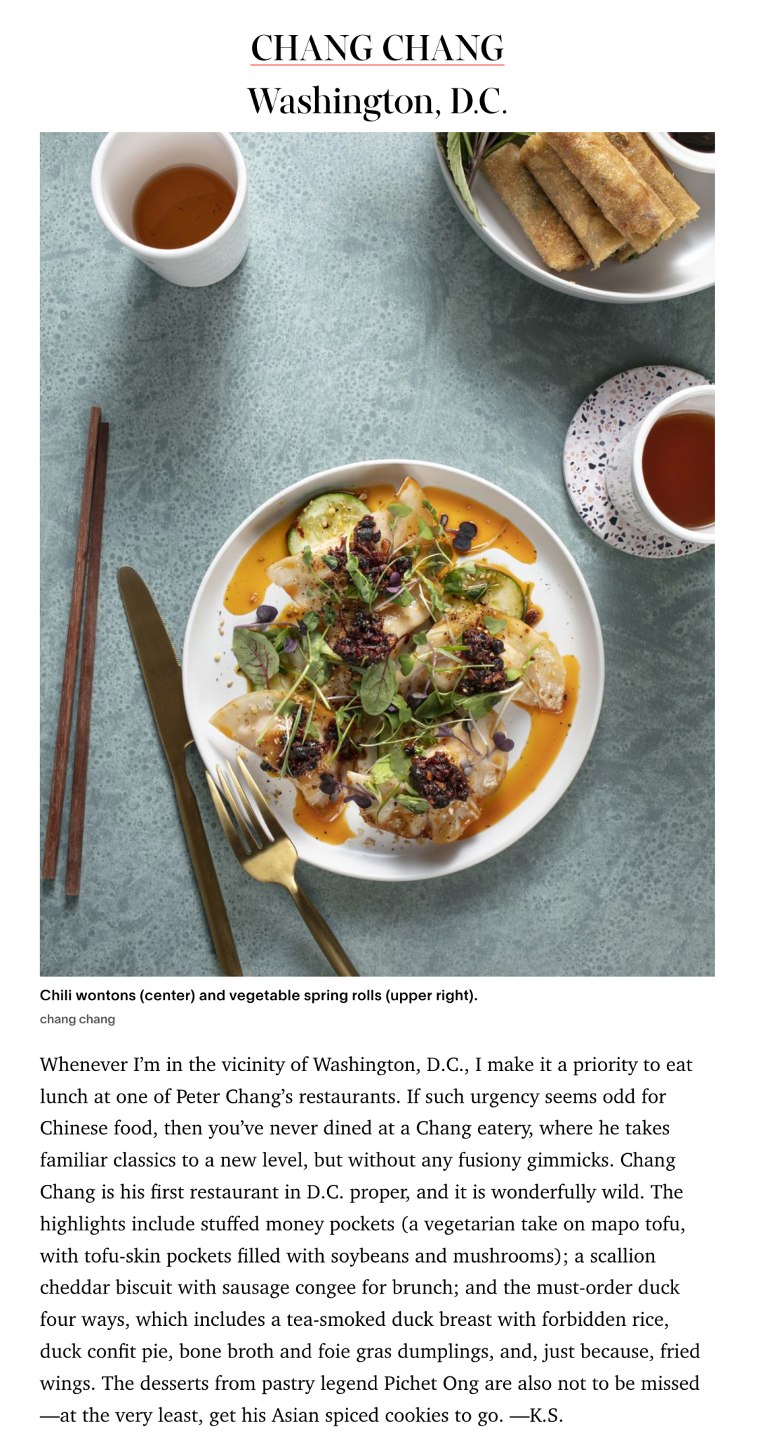 本网讯 美国历史最悠久的知名男性杂志《Esquire(时尚先生)》近日评选出“美国五十最佳新餐厅”,仅有一家中餐厅入选。这家中餐厅,就是《餐饮家》报道过多次的,美国最知名的中餐名厨张鹏亮(Peter Chang)开在华盛顿DC的Chang Chang。