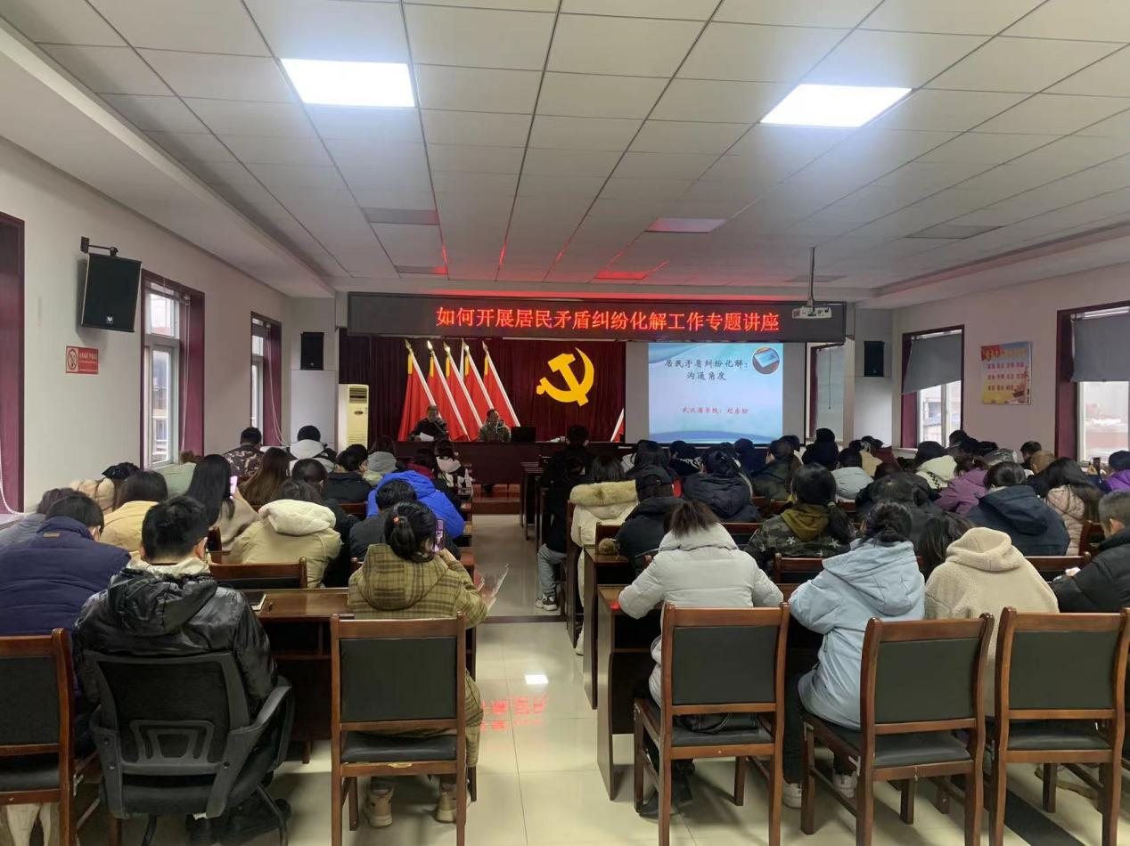 本网讯 为推动学校平安建设工作走深走实,按照上级关于平安建设联系点工作相关指示精神,结合前期走访调研工作实际,11月30日下午,马克思主义学院副院长刘宗劲应邀赴平安建设联系点韩家墩街道办事处开展题为《居民矛盾纠纷化解:沟通视角》的普法讲座,街道办事处辖区50余名社区工作者参加。