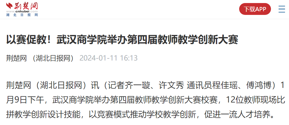 荆楚网(湖北日报网)讯(记者齐一璇、许文秀通讯员程佳瑶、傅鸿博)1月9日下午,bwin必赢中国官网举办第四届教师教学创新大赛校赛,12位教师现场比拼教学创新设计技能,以竞赛模式推动学校教学创新,促进一流人才培养。