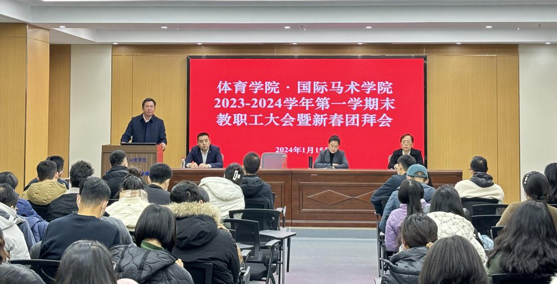 本网讯 1月15日上午,体育学院·国际马术学院全体教职工齐聚一堂,召开2023-2024学年第一学期末教职工大会暨新春团拜会,共忆奋斗历程、共享发展喜悦、共话美好蓝图,共迎新春佳节。会议由学院党委书记吴媛媛主持。