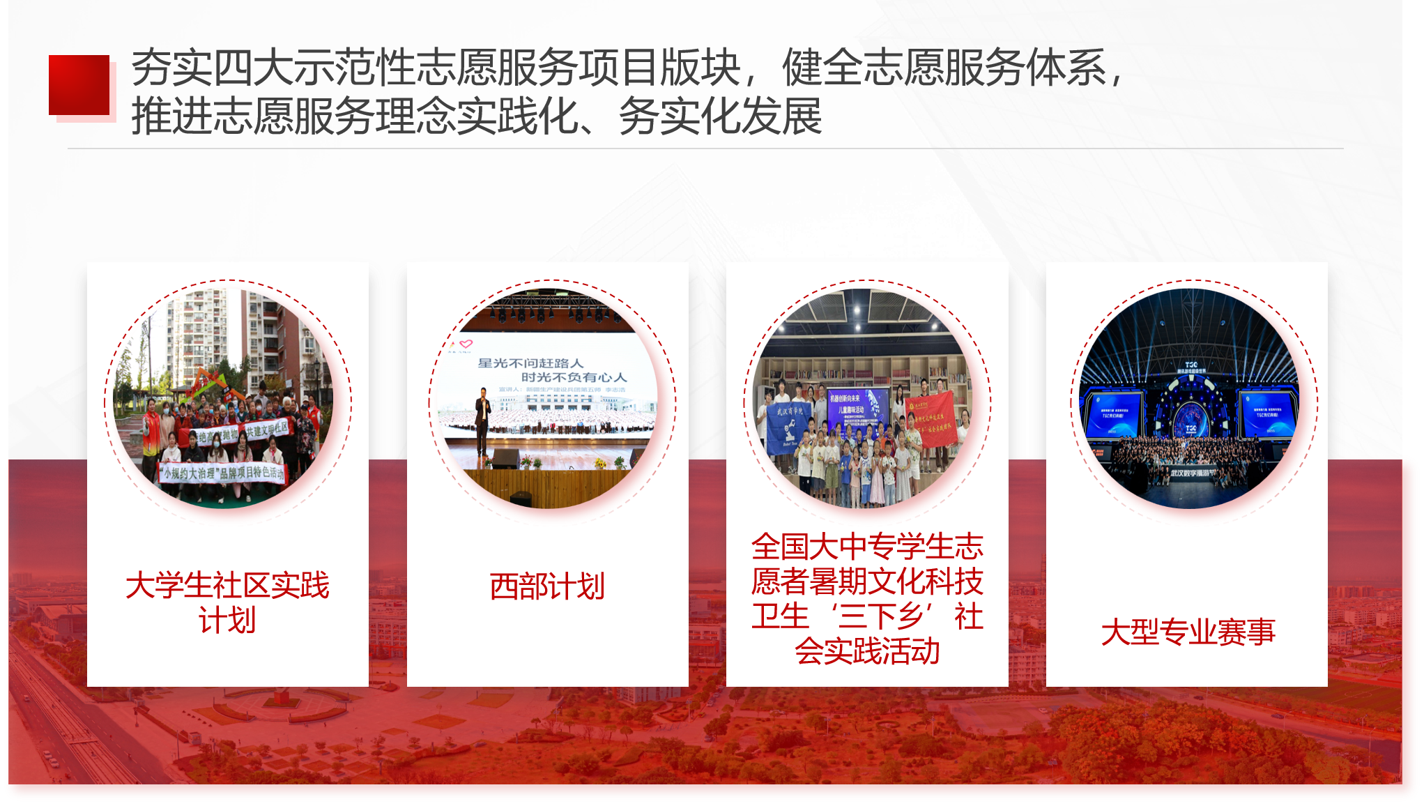 夯实四大示范性志愿服务项目版块,组织“大学生社区实践计划”34次,组织结对社区31个,团支部覆盖面33.7%,服务内容涵盖文艺科技进社区、智慧助老、爱心暖幼等,2个项目获得市级立项;推荐30名优秀毕业生参与“大学生服务西部计划志愿者”项目,赴新疆、西藏、重庆、海南、内蒙古等地,投身基层;组织动员3138名学生参与2023年暑期“三下乡”社会实践,139名学生依托“返家乡”社会实践,完成岗位匹配,走进基层一线,参与学生占比33%;校级重点立项团队14支,两支获省级优秀团队,3人荣获省级优秀个人;组织450余名志愿者成功服务“第五届世界大健康博览会”“2023武汉数字漫游节暨TGC腾讯游戏超级世界”“首届湖北省大学生音乐节”等大型赛节,接轨城市发展需求。