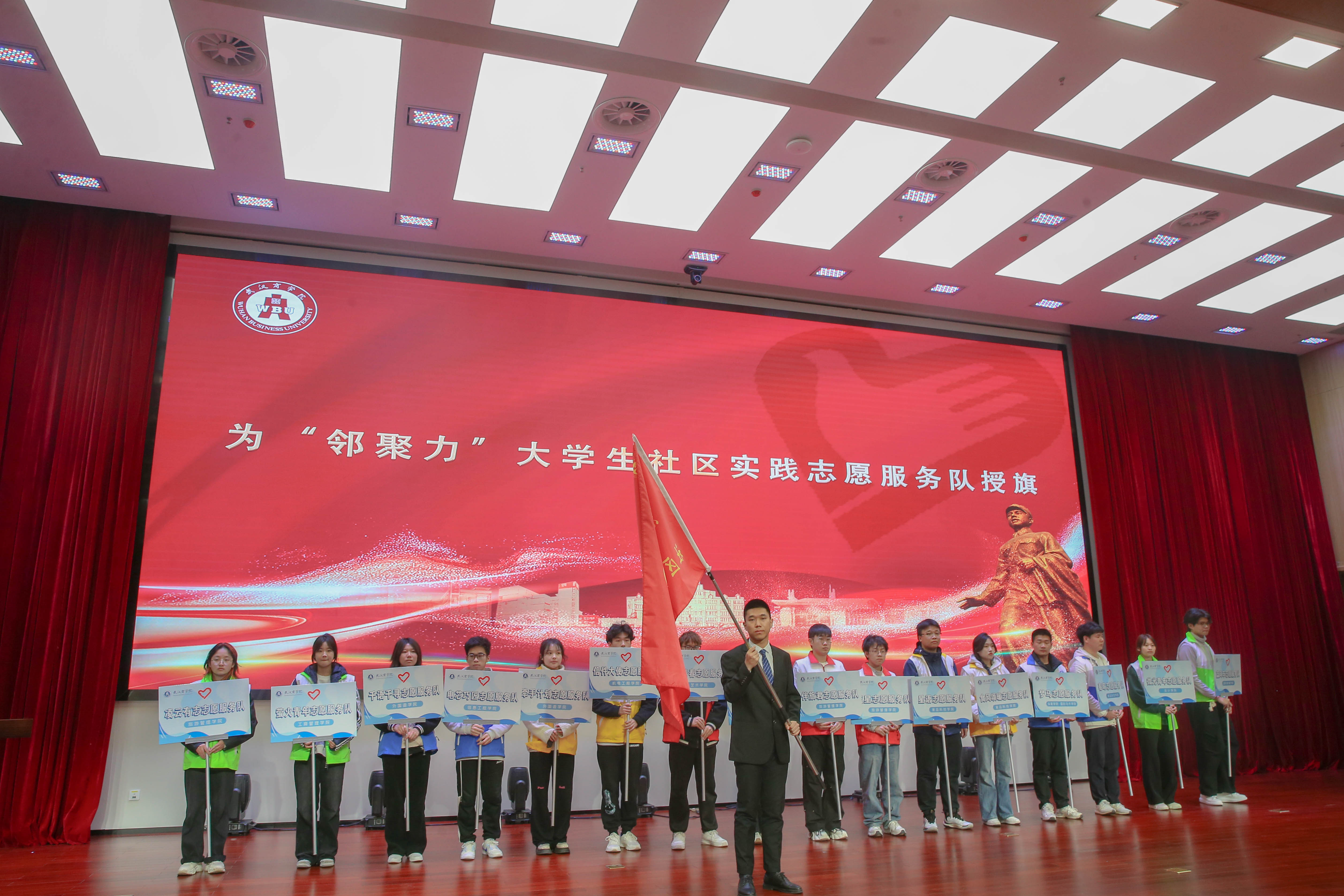校团委书记江雯发布2024年学校学雷锋志愿服务月“七个一”系列活动安排,党委宣传部常务副部长易先勇为“邻聚力”大学生社区实践志愿服务队授旗,校青年志愿者协会指导教师欧阳婧作2023年学校青年志愿服务工作报告。