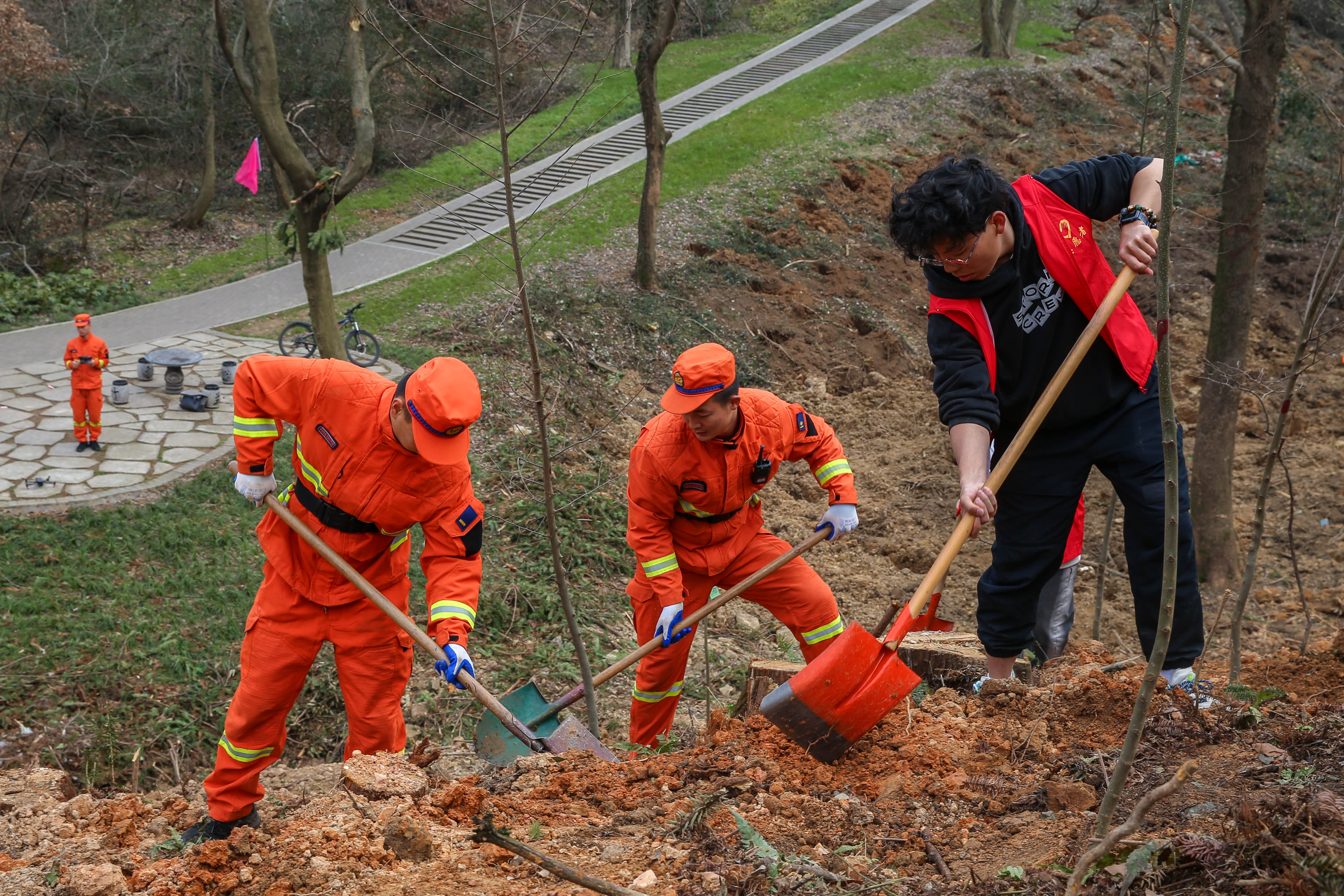 植树完成后,还有余力的队员们还和一同来参加义务植树活动的国家消防救援局湖北机动队伍的队员们一起合力种植了几棵小树。据国家消防救援局湖北机动队伍班长王文龙说,中国森林消防的工作以预防山火为主,今年冬天的冻雨使山上的很多树木都受到了破坏,种植新的树木有利于恢复生态环境。“作为森林绿色生态的‘守护者’,植树不仅是我们的一项任务,更是我们的使命。每年我们来种树的时候都会看到很多高校学子也在参加。看到这么多挺膺担当的时代青年意识到植树的重要性,我们发自内心地感到高兴。”王文龙说。