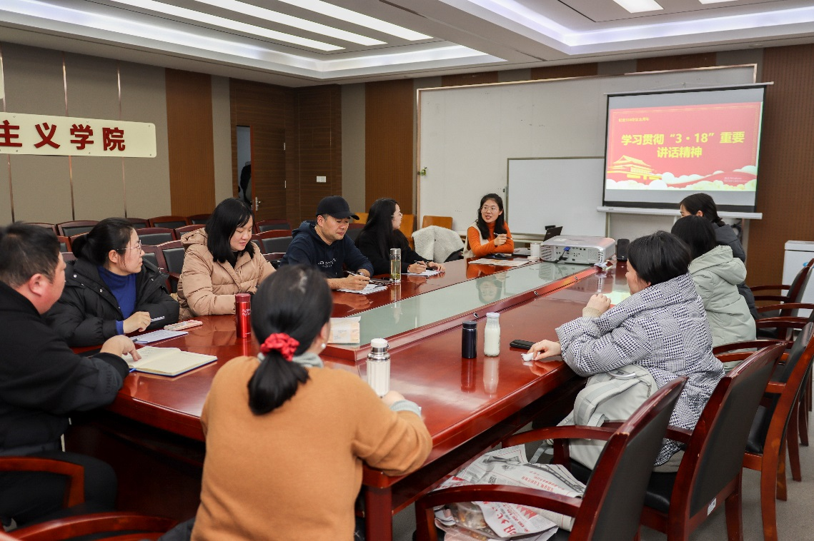 教职工政治理论学习专题学习。3月5日下午,各教学部组织全体教师重温习近平总书记“318”重要讲话,大家认真学习后进行了热烈的讨论。“毛泽东思想和中国特色社会主义理论体系概论”教学部杜晓雯老师从一名新晋思政课教师的角度,从教学困惑、解决思路及教改科研方向设想等方面分享了自己的想法。张泽强老师从教学准备,教学管理,教学反馈三个方面分享了自己校外实践教学经验,并对老师们的具体问题分享了自己的看法。“思想道德与法治”教学部张之涵老师表示:自己成为思政课教师以来时常反思“要成为一名什么样的思政课教师?面对学生时我们能教授他们什么?我在学生的心里会是经师还是人师?”通过时常重温习近平总书记对思政课教师“六个要”的期望,明确了自己的努力方向。心理健康教育教学部陈婧老师认为,《心理健康教育》课程服务于完善人格塑造、促进全面发展这一育人目标。在教学中通过课程思政,达到了启智润心和培根铸魂的目的,从而培养全面发展的社会主义建设者和接班人。