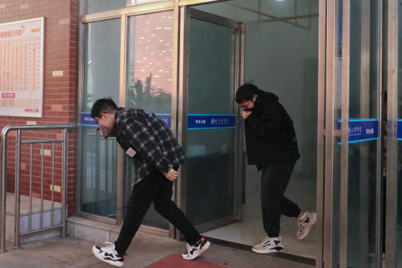 首先由武汉经济开发区全力消防救助站的分队长麻俊福为大家讲解了一些常见的起火原因,如锂电池起火,并告诉同学们逃生时要谨记这十二个字:“弯腰低肢,捂住口鼻,紧张有序。”麻俊福还表示,宿舍管理人员在火情突发时的引导作用至关重要。紧接着,保卫处人员在二到六层楼楼梯间点燃了烟雾弹模拟起火点,顷刻间烟雾四溢,同学们拿着打湿了的毛巾捂住口鼻,弯着腰在宿舍管理人员的引导下,从安全通道有序疏散至空旷区域。