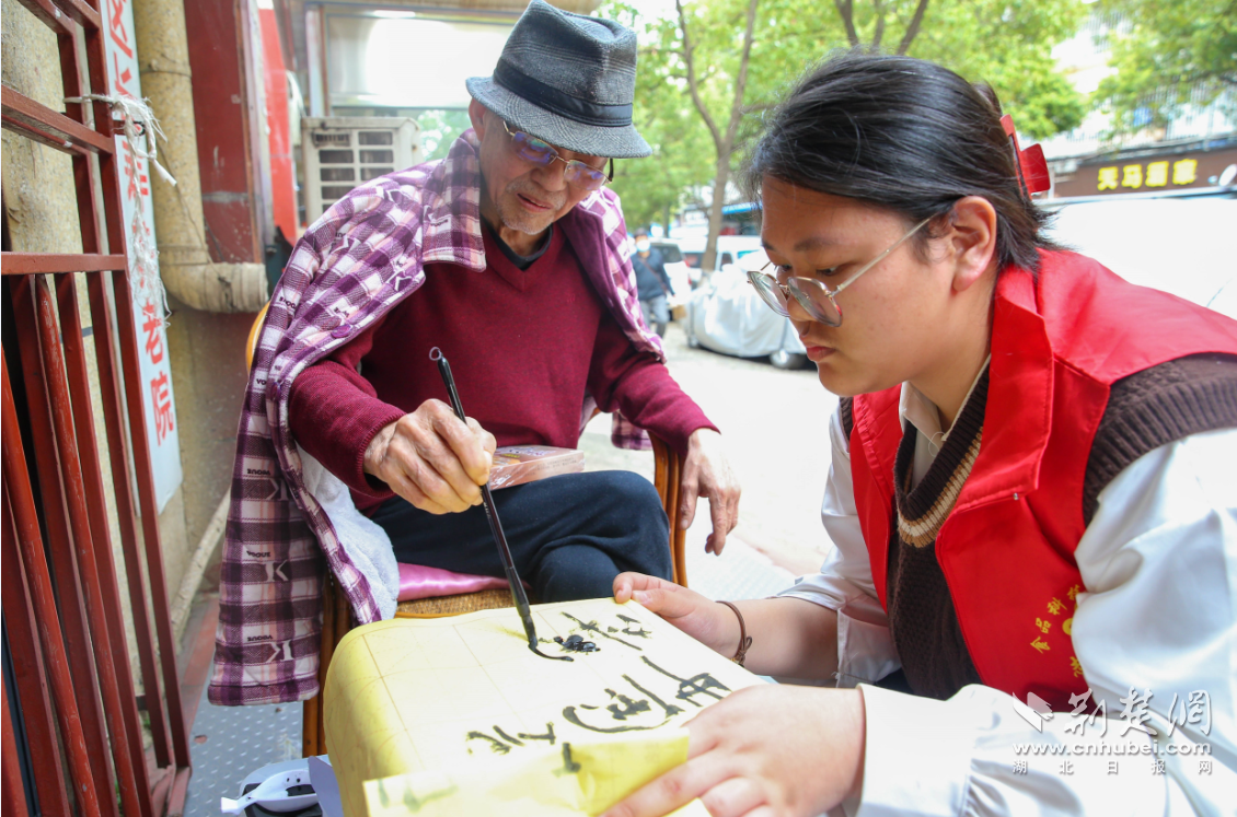 楼下,志愿者邓城希拿着书法套装与77岁的老人谢林生一同写字。拿着米字格纸,邓城希在谢林生的指导下开笔、沾墨,然后笨拙地写下:“祝爷爷奶奶身体健康。”志愿者们又在一旁希望老人谢林生也写两句,略一思索过后谢林生提笔写下——中国人民解放军。谢林生曾是一名坦克兵,他说:“我以前是开坦克的,差一点上战场。不打仗好啊,如今太平的日子,我很是珍惜。”志愿者黄任弢听后深有感触:“河清海晏,山河永安。”有感而发,在自己的宣纸上写下“山河永安”。