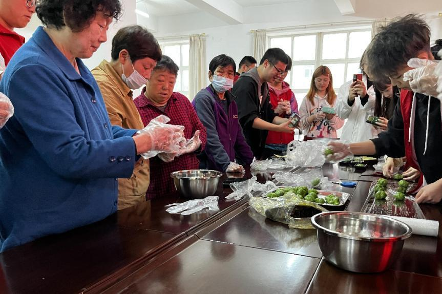 在社区老人们到来之后,大家将青团皮料和豆沙馅包在一起制作青团,同时在忙碌中与老人们嘘寒问暖,了解老人们的需求,帮助老人们解决生活和心理之所需,提供心灵慰藉与精神支持,增强对老年人的关爱与尊重。