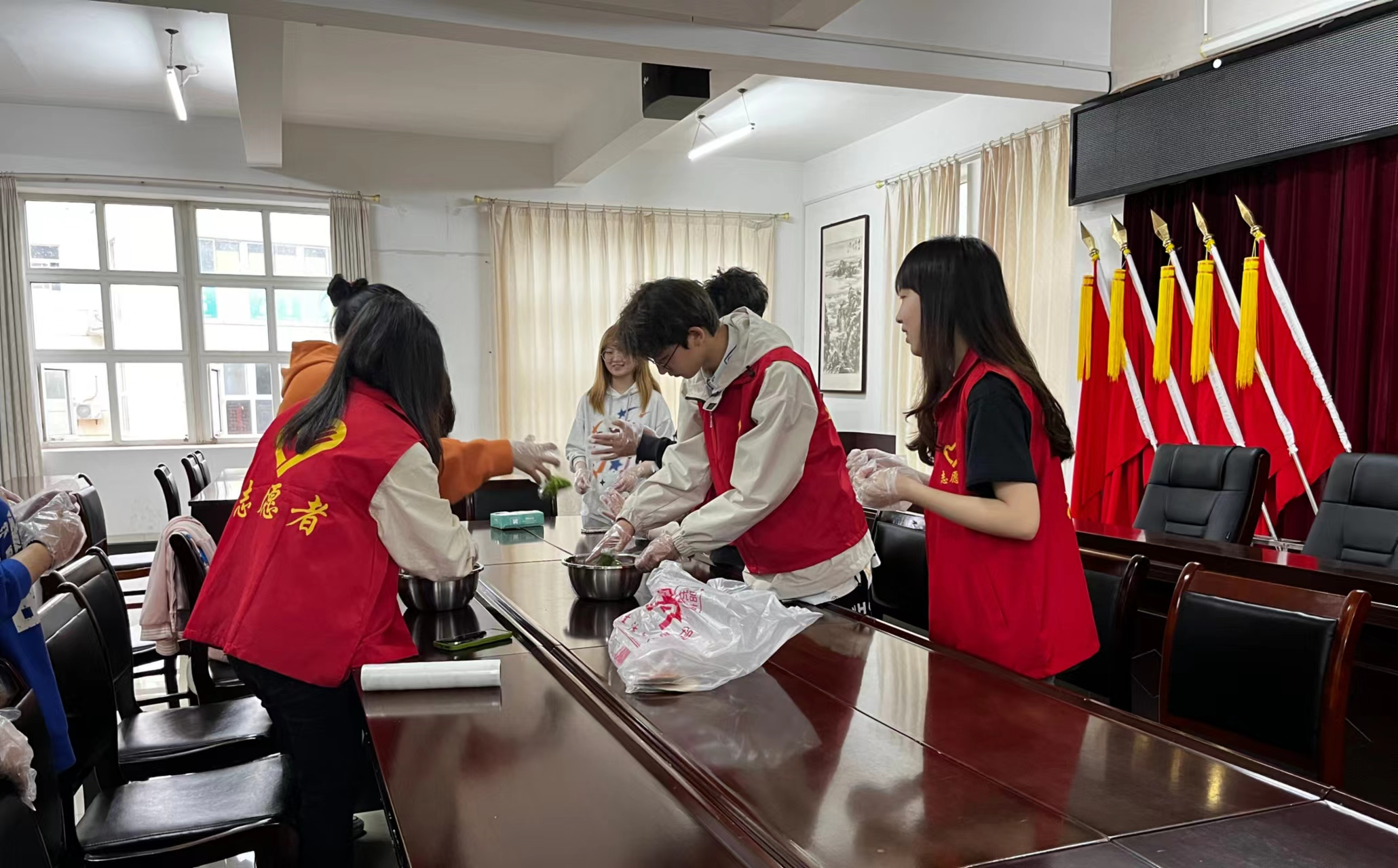 上午8点,志愿者们从学校出发,准时抵达莲溪社区,所有参与人员有序进入社区并分配任务。活动成员提前准备好了青团材料,在清洁好制作工具、摆好桌椅后,耐心等待社区老人们的到来。