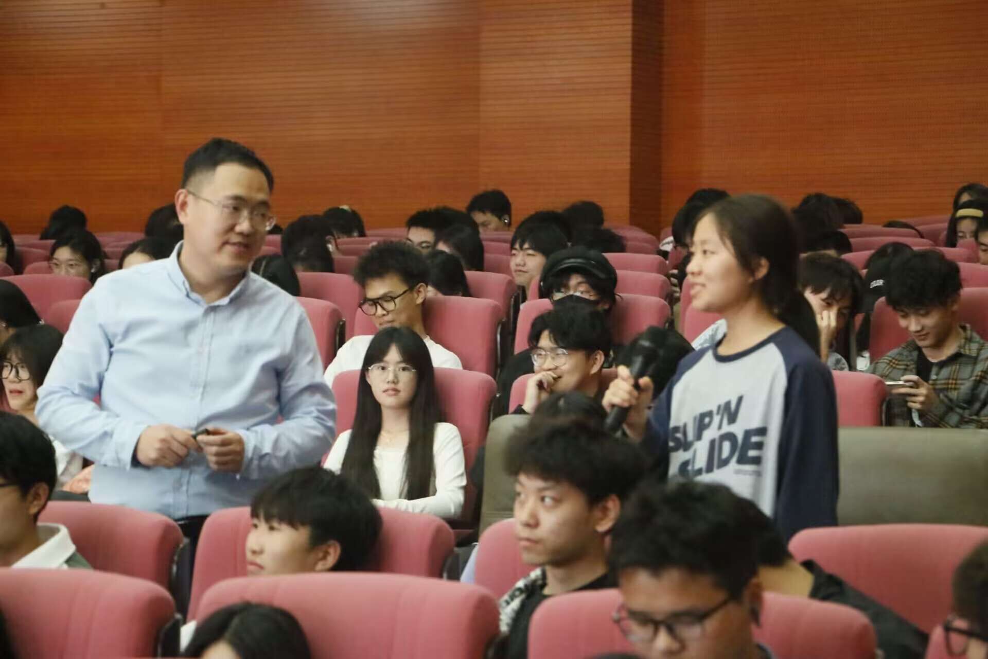 讲座中,宋晋主要从“爱情是什么”“爱情不是什么”“爱情可能是什么”这三个方面展开讨论。首先,宋晋从身边的事例出发,向同学们发问:到底爱情是什么?用互动的方式让学生们来讲述自己所认为的爱情究竟是什么,随后,他通过音乐短片,结合心理学理论向同学们解释,爱情中的三角理论,即亲密、激情与承诺三大要素,他指出,爱情是以亲情为指向和归宿的,其不仅是一种深刻的人际连接,更是一种灵魂的契合。