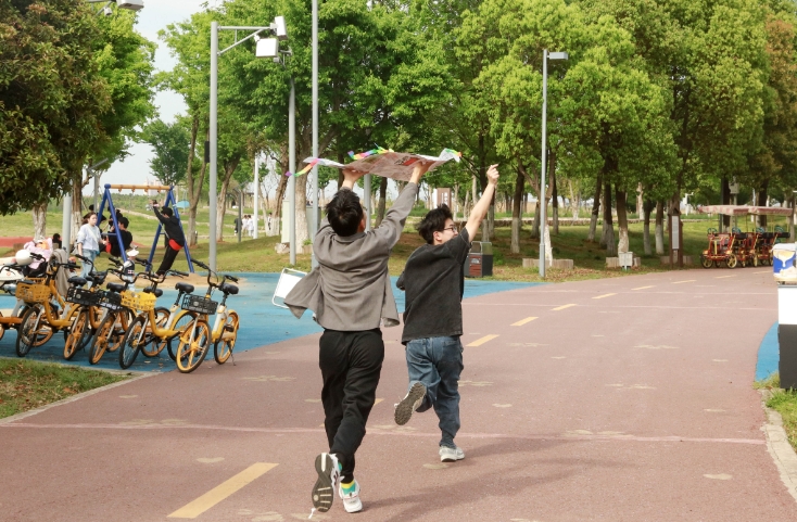 本次活动可以用旧报纸制作风筝或亲手彩绘风筝。制作风筝首先要考虑的是风筝骨架的扎制,同学们先用木条搭好骨架,再把旧报纸裁剪至合适的形状后粘贴在搭好的骨架上,最后系上线和弓弦,一个牢固的风筝便初见雏形。“排布骨架时要注意给风筝留出泄风的风兜,有利于风筝稳定放飞。”2023级机电工程学院建筑环境与能源应用工程专业何一鸣分享说。动作创意彩绘风筝DIY是在原有的风筝艺术上创新,让风筝重新焕发生机,同学们充分发挥想象力与创造力,一笔一划将心中的色彩与想象跃然风筝之上。色彩斑斓的风筝搭配流畅的线条,不一会儿,同学们便做出了属于自己的风筝。随着一只只风筝的完工,大家都迫不及待来到草地里,三三两两相互合作,兴致勃勃地把手中的风筝放飞蓝天。同学们手握轴线,一路小跑,时而拉线放线,时而前后轻抖,精确控制着风筝升空的速度和放飞的高度。