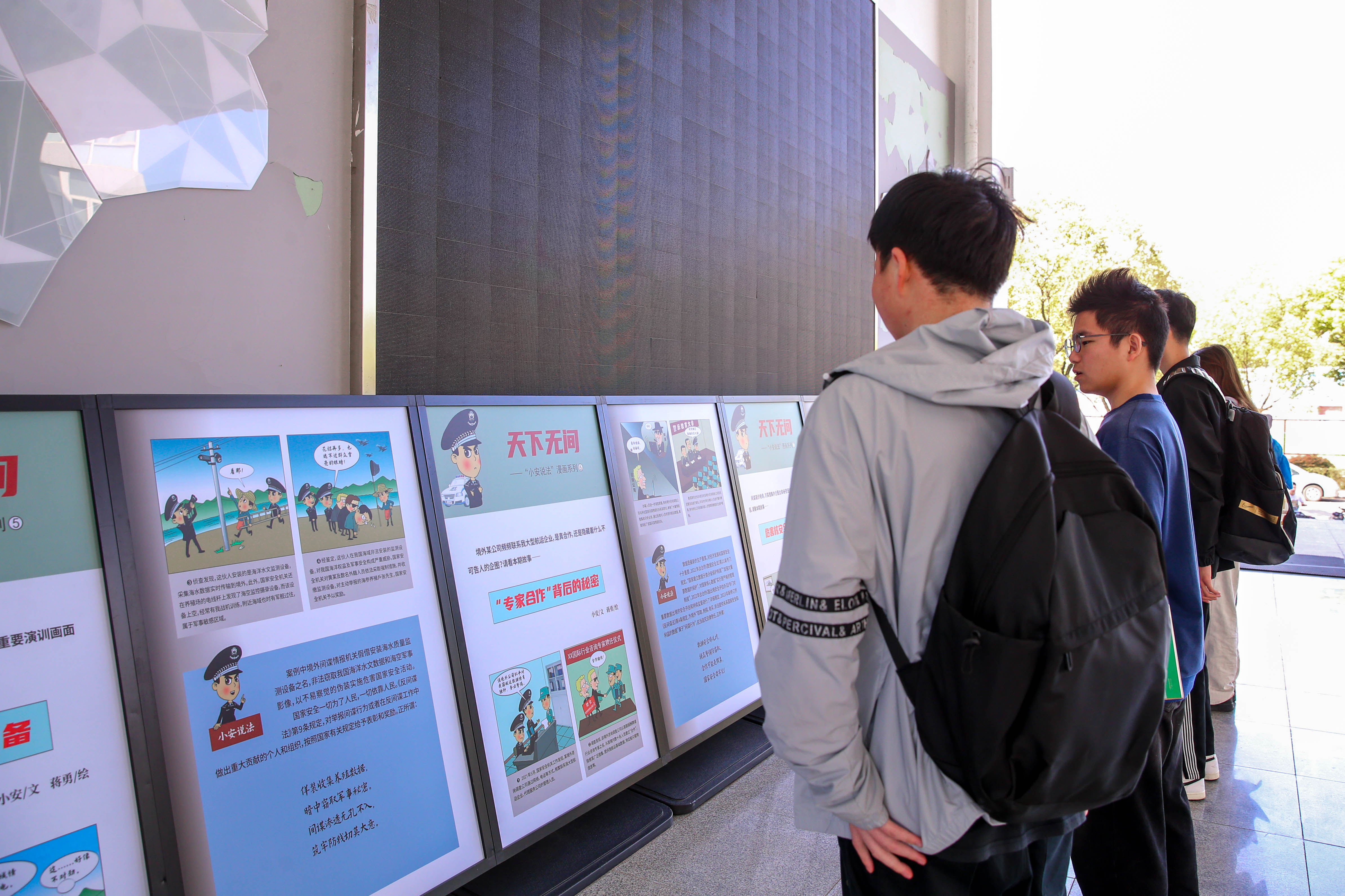 不仅有各种“干货满满”的二维码,园区内,一块大大的电子屏幕也吸引了不少人的注意力。各种国家安全主题教育宣传片、习近平总书记关于总体国家安全观的重要论述等内容在电子屏幕上被滚动播放,“视频一体机也是园区的一大亮点,我们还把这个视频一体机放在了园区最显眼的位置,充分发挥了‘云课堂’新媒体矩阵传播优势。”庞健宜说,“视频内容分国安视界、青年实践和国安e学三个学习单元。希望通过丰富的视频内容让更多人深刻理解把握国家安全教育内涵,做国家安全的学习者和实践者。”