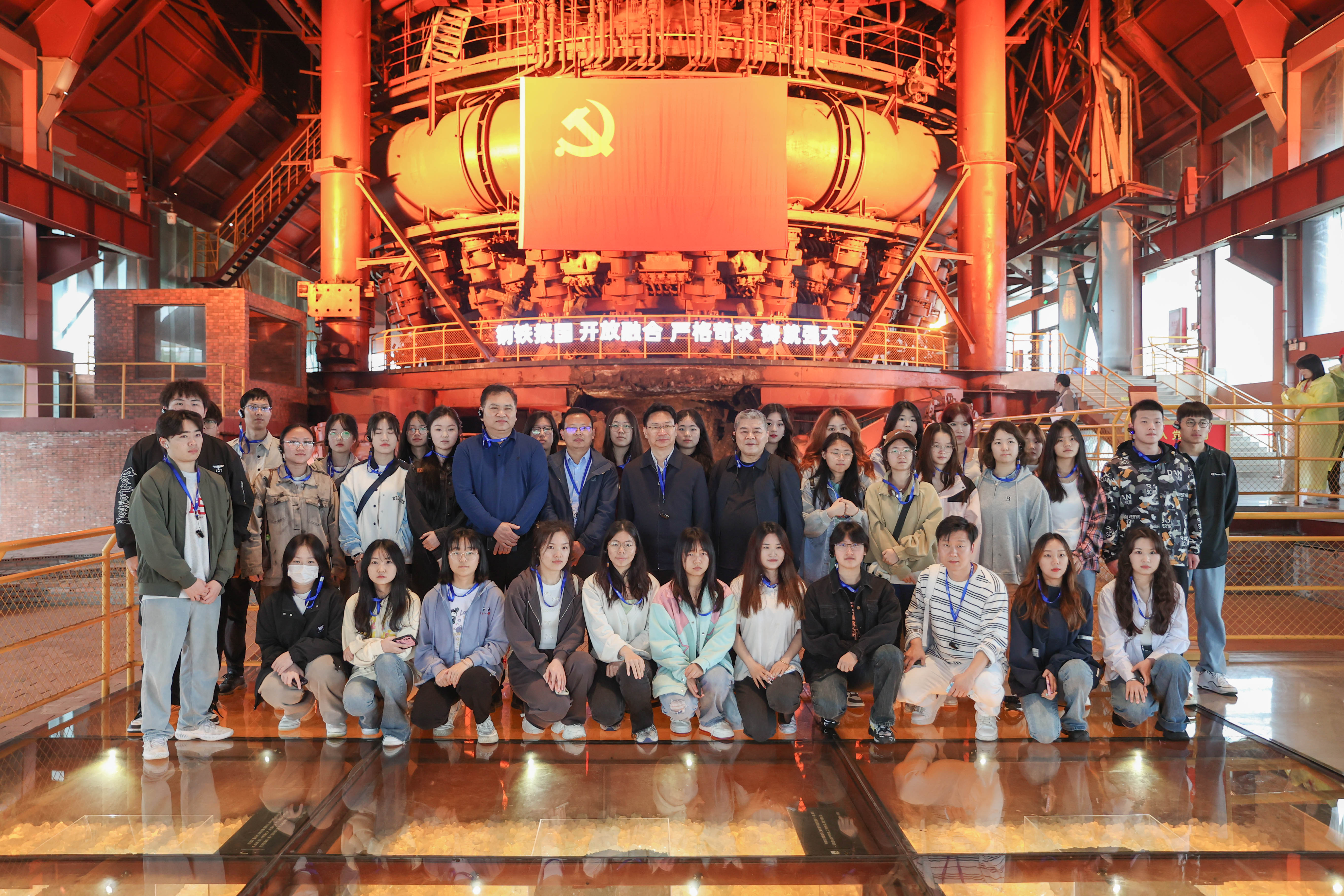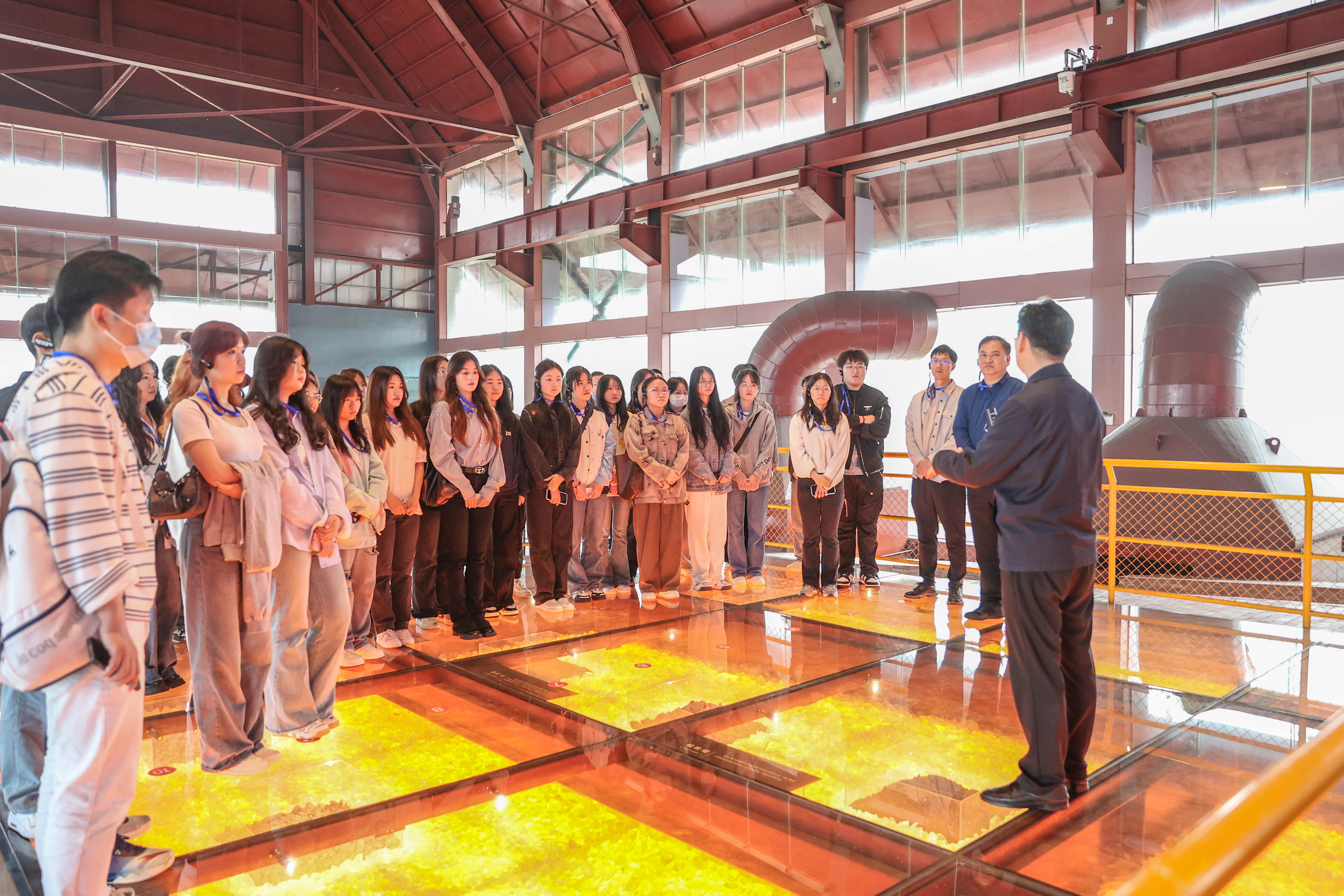 前往二楼,金黄高耸的一号高炉遗址映入眼帘,仿佛能看见当年激动人心的铁花奔涌。彭瑜随即在一号高炉遗址前根据实景给学生们开展了思政课教学:“同学们在参观时要着重看三个东西,一是可以看看武汉钢铁的生产线,直观感受钢铁熔铸工艺,长篇小说《钢铁是怎样炼成的》是写人百炼成钢,今天我们到武钢中实地感受真正的钢铁是怎样炼成的;二是看看武钢的队伍是怎样‘炼’成的,学习和了解武钢的建设历程以及一批又一批武钢人对国家发展的贡献;三是要看武钢文化的内核,其对于民族复兴所贡献的价值,这正是需要一代青年大学生所需要肩负的振兴产业和民族复兴的重任。”