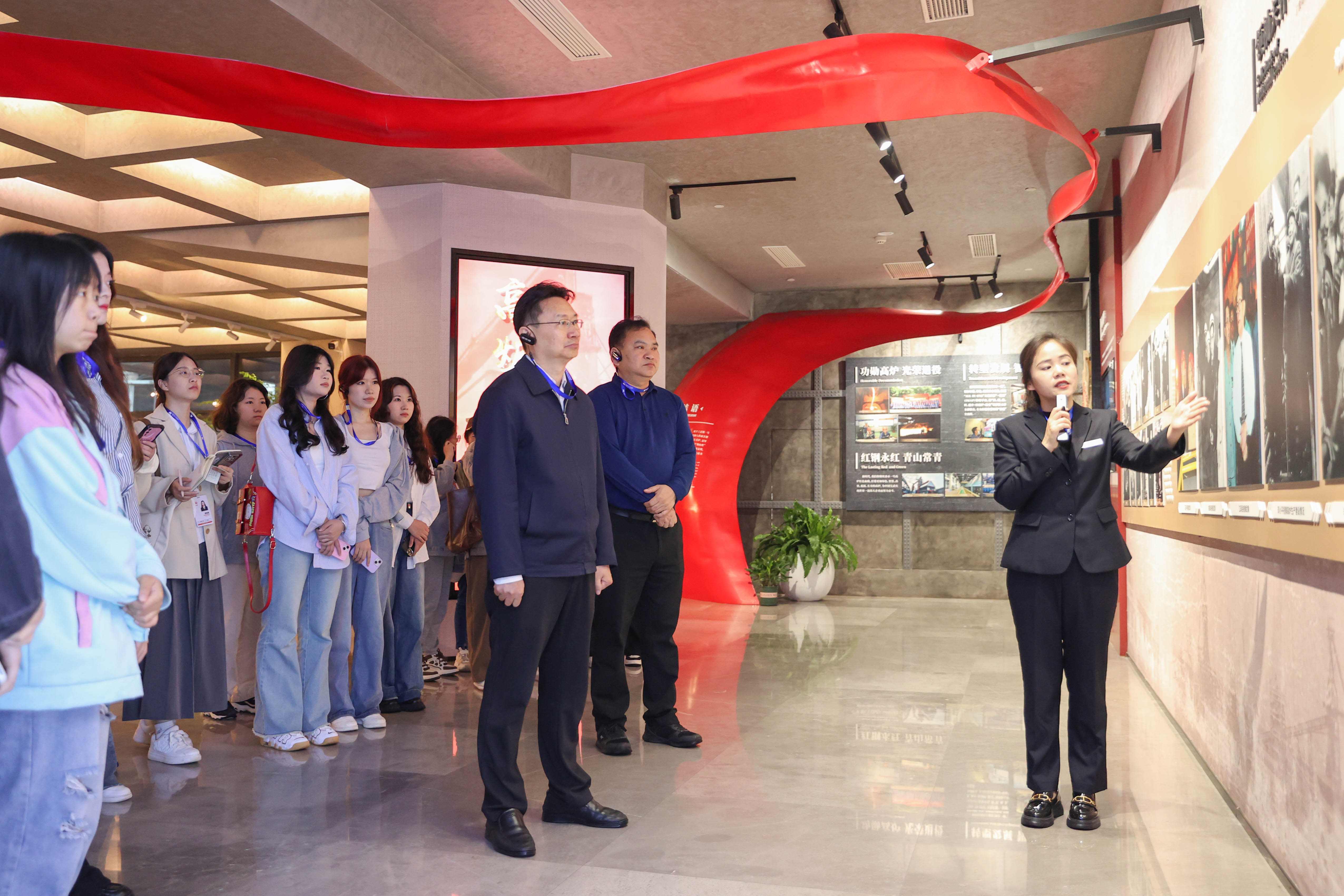 走进一号高炉遗址公园,跟随旅游区讲解员的步伐,师生一同重温了武钢一号高炉从建成投产到“光荣退役”的热血历史。讲解员讲述着近代以来中国的钢铁追求:“1958年9月13日,武钢一号高炉出世,毛泽东主席到炉台观看高炉出铁,这一天也成为武钢的诞生日。”在一楼陈列台前,彭瑜与学生们一起参观了第一炉铁水生铁实物、铁水运输的铁道、老照片记忆柜。