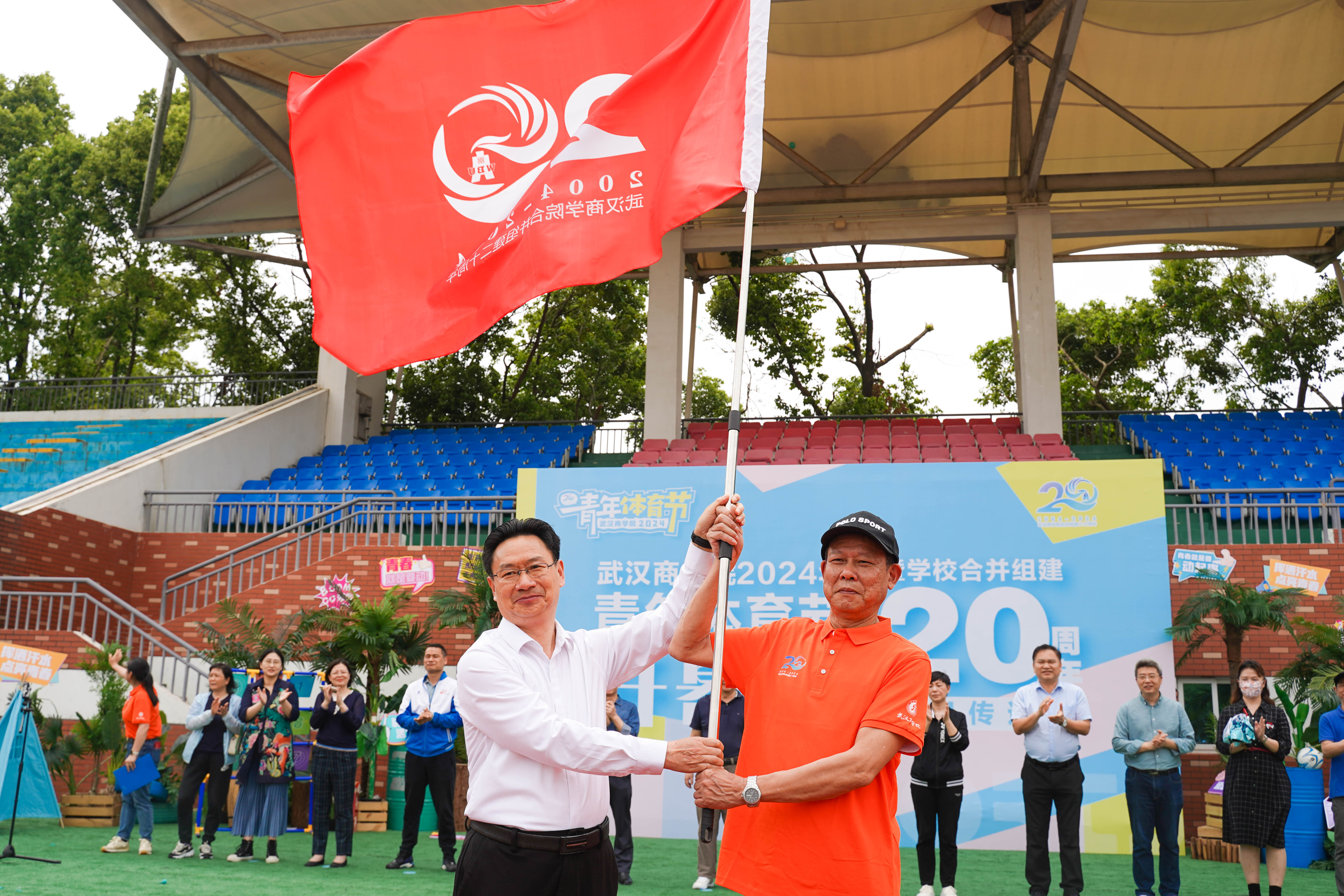 旗帜跑传递活动正式开始。旗帜第一棒由校长彭瑜传给我校荣休教师代表、原离退休工作处教师张耀良,随后烹饪大师万玉梅老师接旗,在加油呐喊声中,我校支社主委、科研处汤云教授、骨干教师代表丁辉教授、青年教师代表闵雪红教授及张明月老师接过旗帜绕操场挥旗一圈。紧接着,这面承载着推动学校高质量发展的旗帜传到2024湖北省大学生自强之星候选人、食品科技学院马玉婷和湖北省“返家乡”社会实践先进个人、体育学院·国际马术学院张晶宇两位青年学子的手中,他们带着各学院的期望,带着身后的同学们,怀揣着美好的青春与梦想,一起向前奔跑。
