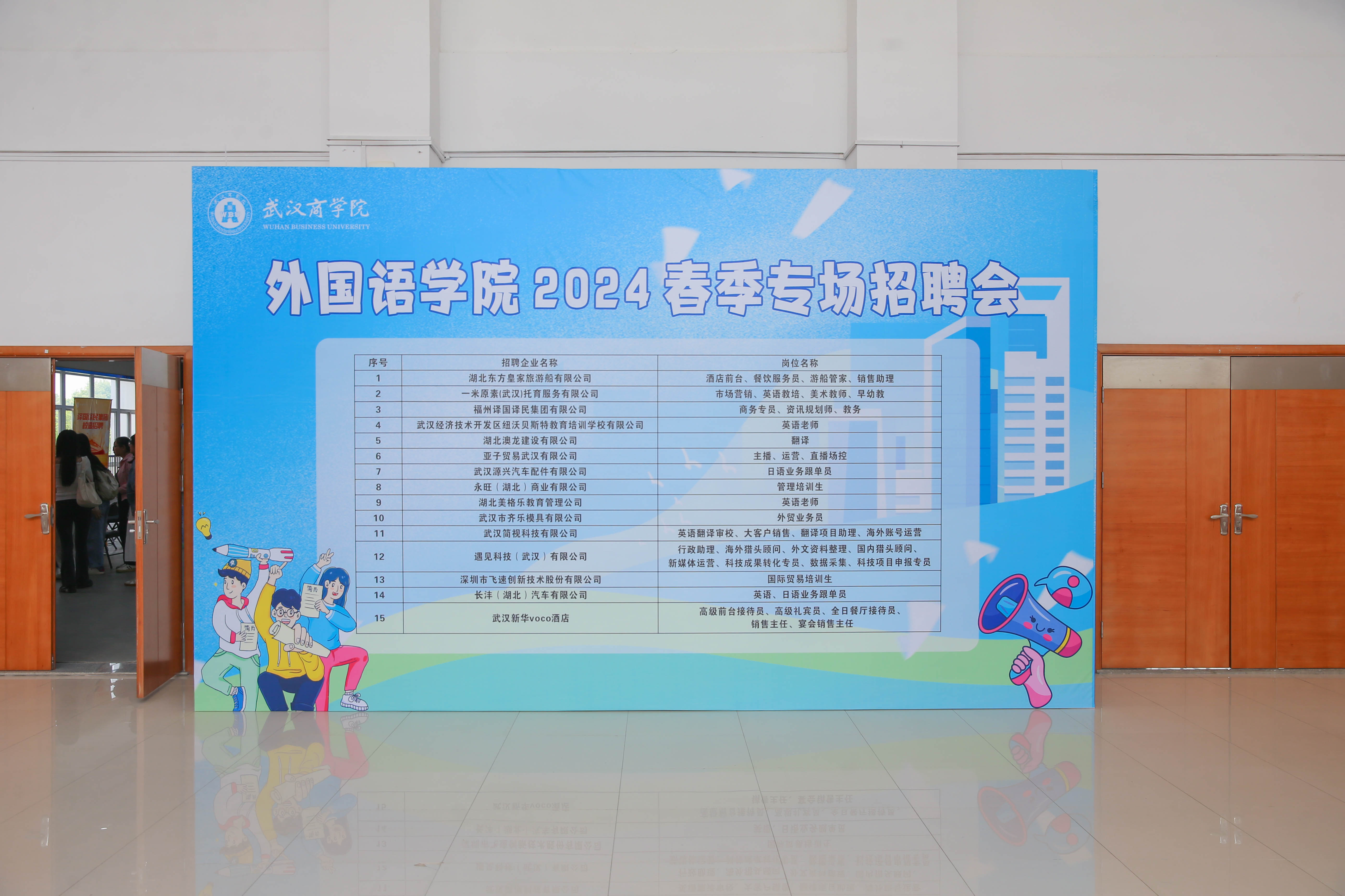 本网讯 为促进高校毕业生高质量充分就业,助力重点产业人才引进,外国语学院抢抓春季招聘“黄金期”。于4月22日在北区大学生活动中心举办2024年春季专场招聘会。此次招聘会邀请15家招聘企业,岗位涉及商务专员、翻译、外贸业务员、海外账号运营等。
