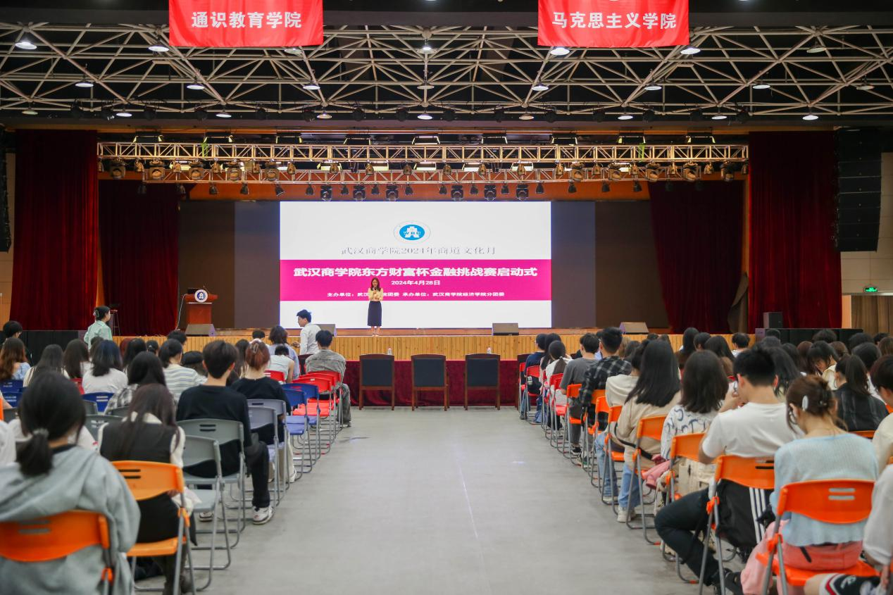 本网讯 4月28日,为了助推学校建设高质量发展,营造浓厚的商道文化氛围,贯彻“商科赋能”理念,在本次2024年“商道文化月”主题活动中,经济学院在北区大学生活动中心顺利召开“bwin必赢中国官网东方财富杯金融挑战赛”启动仪式,并邀请东方财富证券公司专家进行宣讲会。校团委江雯书记、经济学院副院长何少奎、学院副书记张红权及经济学院金融系教师受邀出席本次会议,本次活动由经济学院分团委组织承办。此次宣讲会吸引了包括经济学院和其他学院共计450名学生的参与。