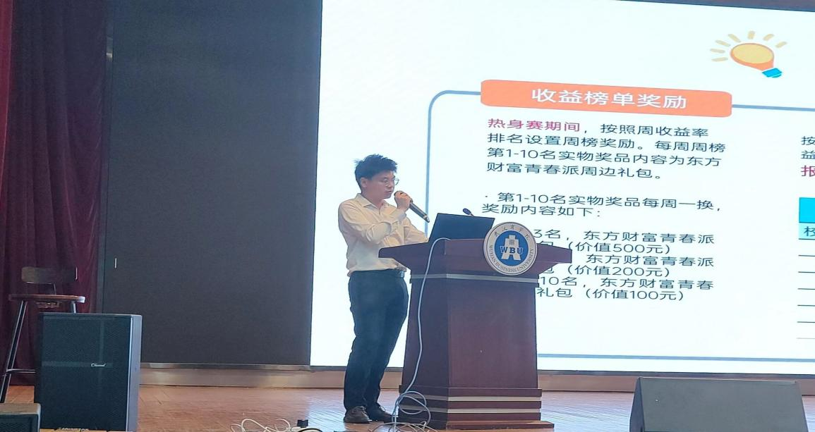 东方财富证券湖北分公司零售管理总监李振宇为我们介绍本次金融素养提升活动背景。他为同学们详细介绍了活动概述、赛事概览、赛事奖励、经验分享等内容。他提出,全国大学生金融挑战赛由共青团中央青年发展部主办,全国学校共青团研究中心、东方财富信息股份有限公司大赛承办。自2014年至今已成功举办九届,关注度与参与度不断攀升,吸引了全国超四百万学生的积极响应,已成为面向全国大学生群体打造的具有高知名度、高含金量及广泛社会影响力的金融市场实践大赛。