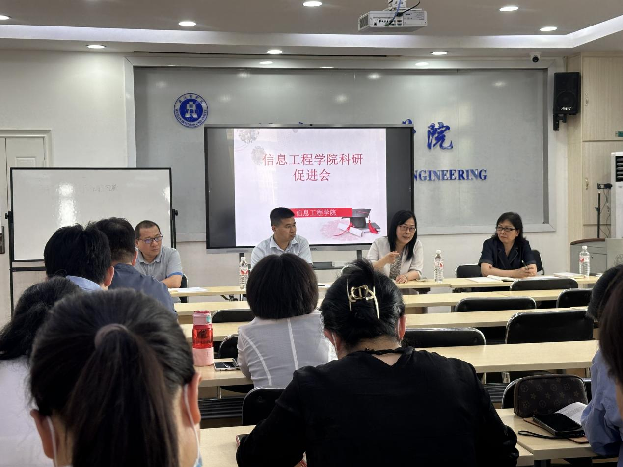 本网讯 为加强有组织科研,推动学院高质量发展,5月16日下午,信息工程学院组织召开科研工作促进会。会议邀请到通识教育学院院长高静,为全院教师做指导与动员。信息工程学院书记黄美忠,副书记宋云清出席会议,副院长孔华锋主持会议。