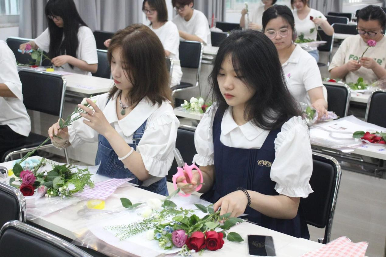 活动现场,花艺老师从花卉的选择、颜色的搭配、花枝配叶的修剪、包装纸的折叠以及如何让花卉错落有致等方面展开了详细讲解,鼓励学生们大胆发挥,自己动手将材料包装成自己喜欢的花束。参加活动的同学们认真聆听,用心感受,一点点摸索实践。面对疑惑和不懂,学生们及时寻求花艺老师的帮助,跟随老师的指导一步步操作,原本一支支零散的花朵经过修建、整理、构建后逐渐创造成为了漂亮的花束。