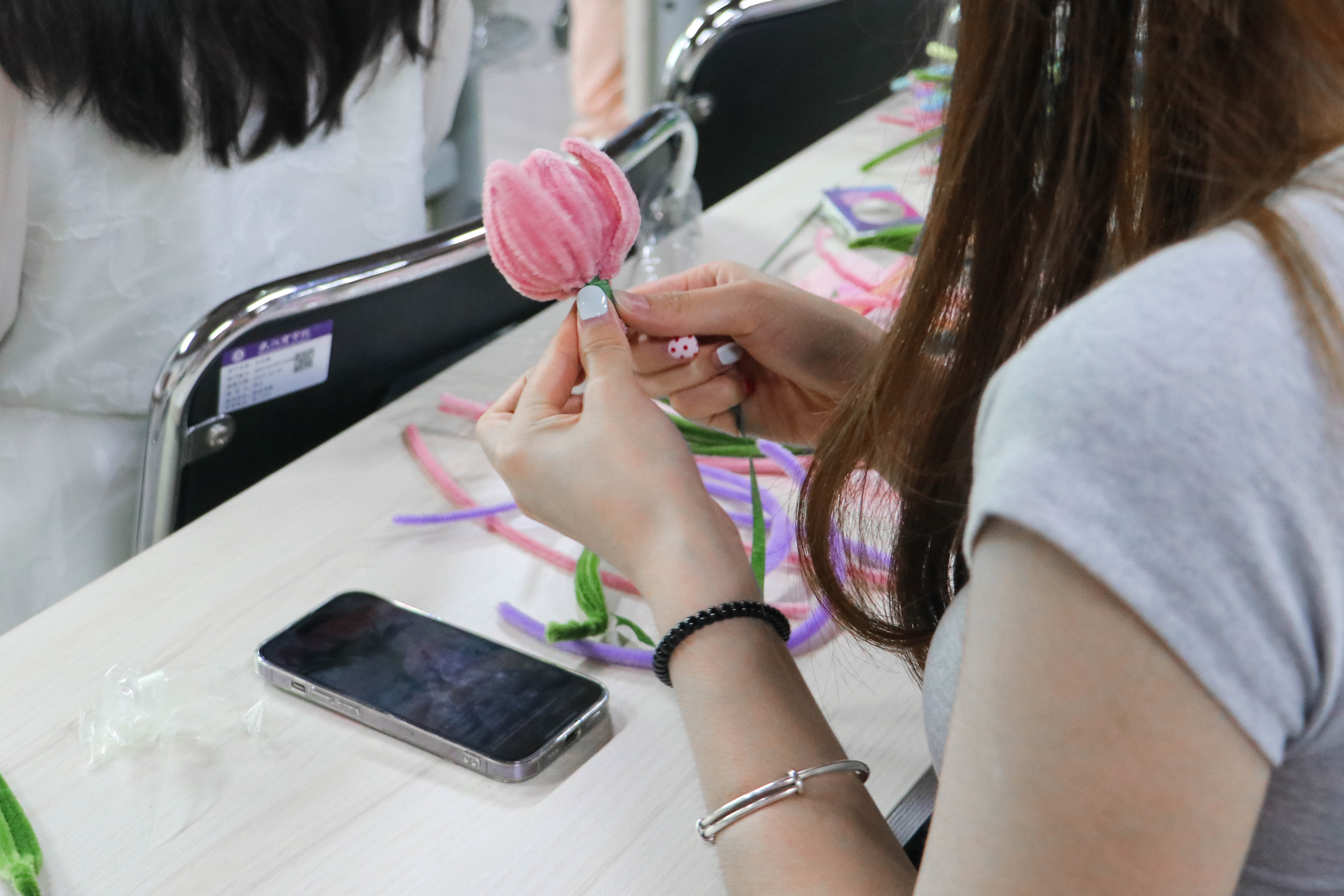 活动现场,来自2023级经济统计一班的吴姝瑶正专注地与同伴用扭扭棒编莲花,将两根扭扭棒对折交叉,底部扎紧固定,再将多余的枝条穿回上端,这样一个莲花花瓣就做好了。她分享说:“一开始觉得扭扭棒最简单,现在感觉是个细致活,这次活动让我们静下心来感受植物手工的魅力,让我们更加贴近自己的内心,接纳内心真实的自己。莲花的花瓣是我们小组大家一起完成的,在看到莲花成型的那一刻很有成就感。现场工作人员也很耐心,及时为我们补充材料,保持会场活动井然有序。”