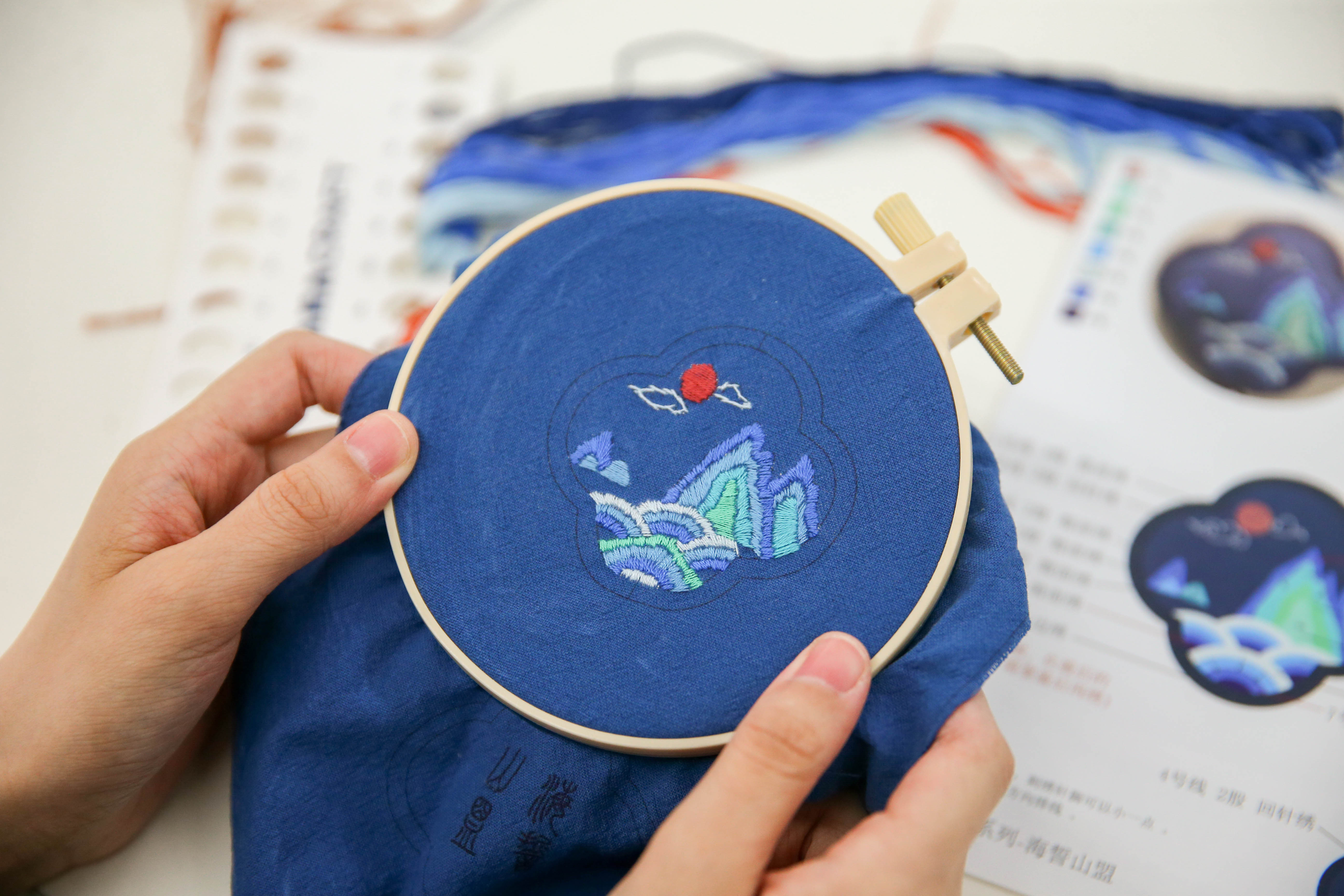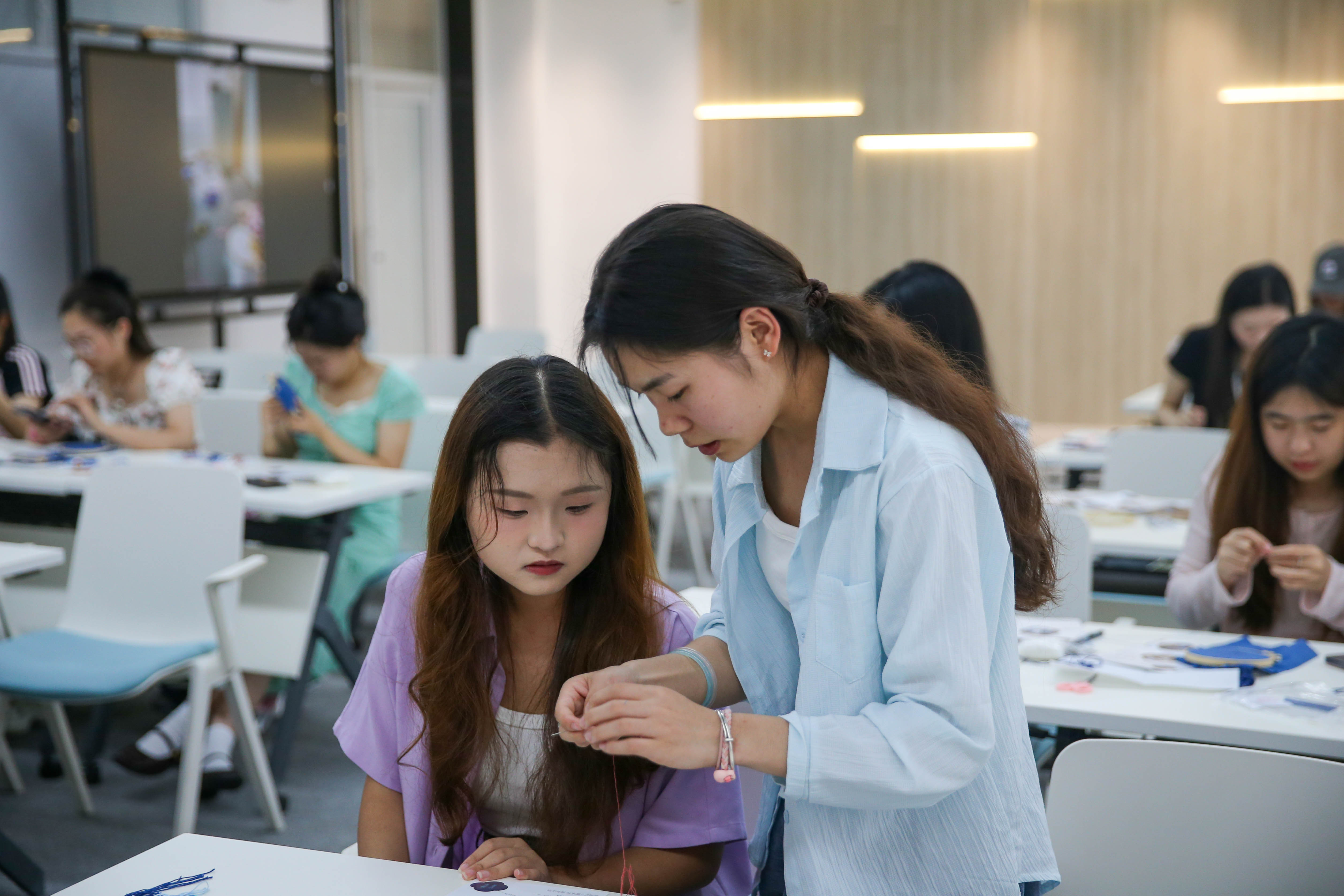 随后,学生们在讲师的指导下,开始动手实践。他们拿起桌上的材料包,穿针、引线、刺布……2022数字媒体艺术一班的王瑾听完讲解后便开始刺绣,不一会儿她的绣布上的山水景色便初具雏形。“我从小就喜欢捣鼓针线这些玩意,小时候在家里经常给自己的玩偶们做衣服。今天听了老师关于汉绣的讲解越发感兴趣了!”在刺绣过程中,张丽莉时不时走下讲台,为有困惑的同学们仔细耐心答疑解惑:“两根绣线对齐,一端穿过针眼,捏住两根线头从线圈拉出。”2023烹饪营养与教育一班程迪分享说:“第一步打结就难住我了!多亏张丽莉手把手教我,我的刺绣作品才得以顺利进行。”