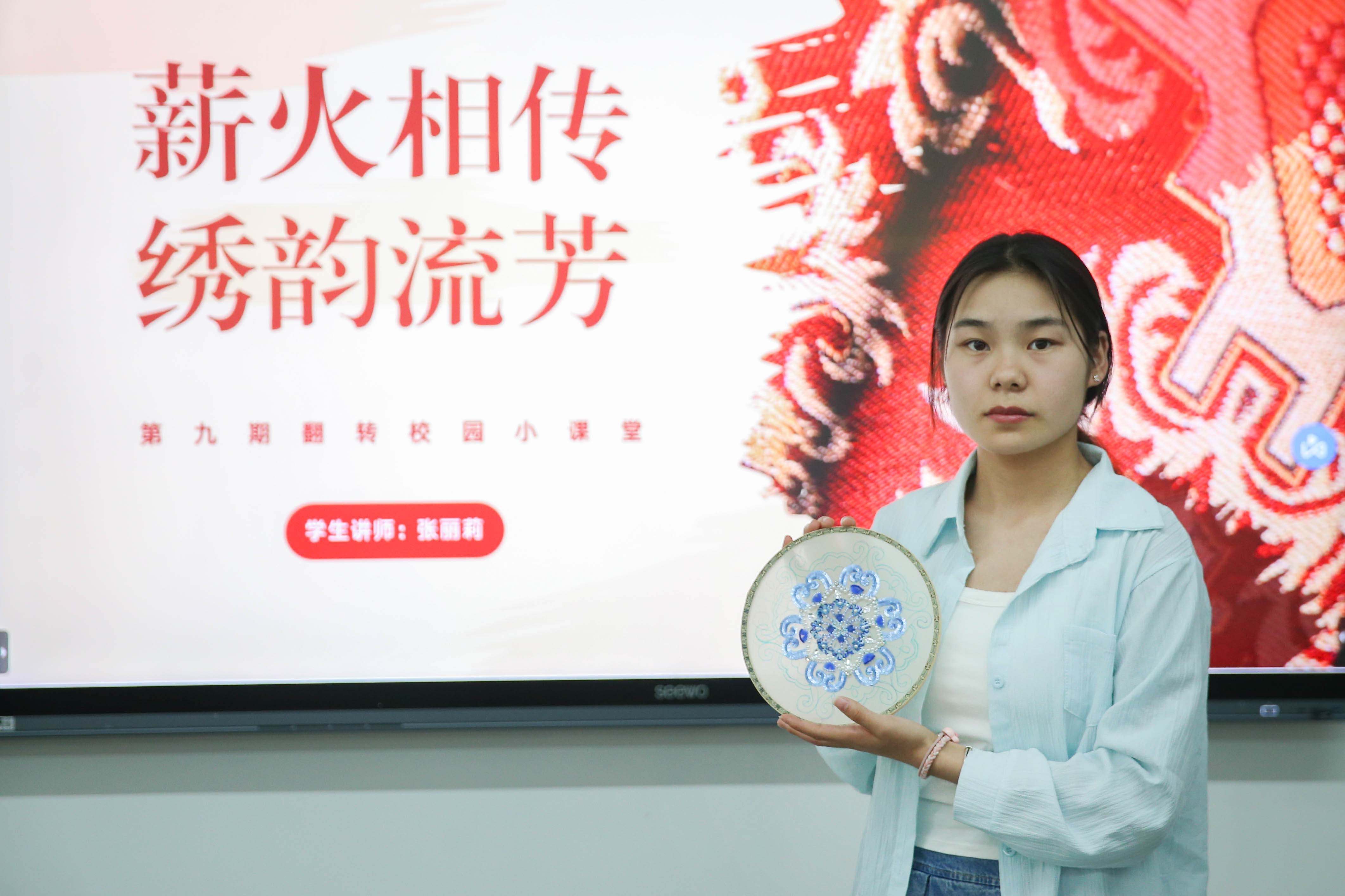 本网讯 手指轻轻捻动丝线,针尖刺入绣布,不停翻飞跳跃。不一会儿,一朵朵精美的花朵便在绣布上缓缓绽放。5月29日下午,我校第九期翻转校园小课堂“薪火相传 绣韵流芳”在北四智慧教室313开展,此次邀请2021级服装与服饰设计专业张丽莉担任讲师。