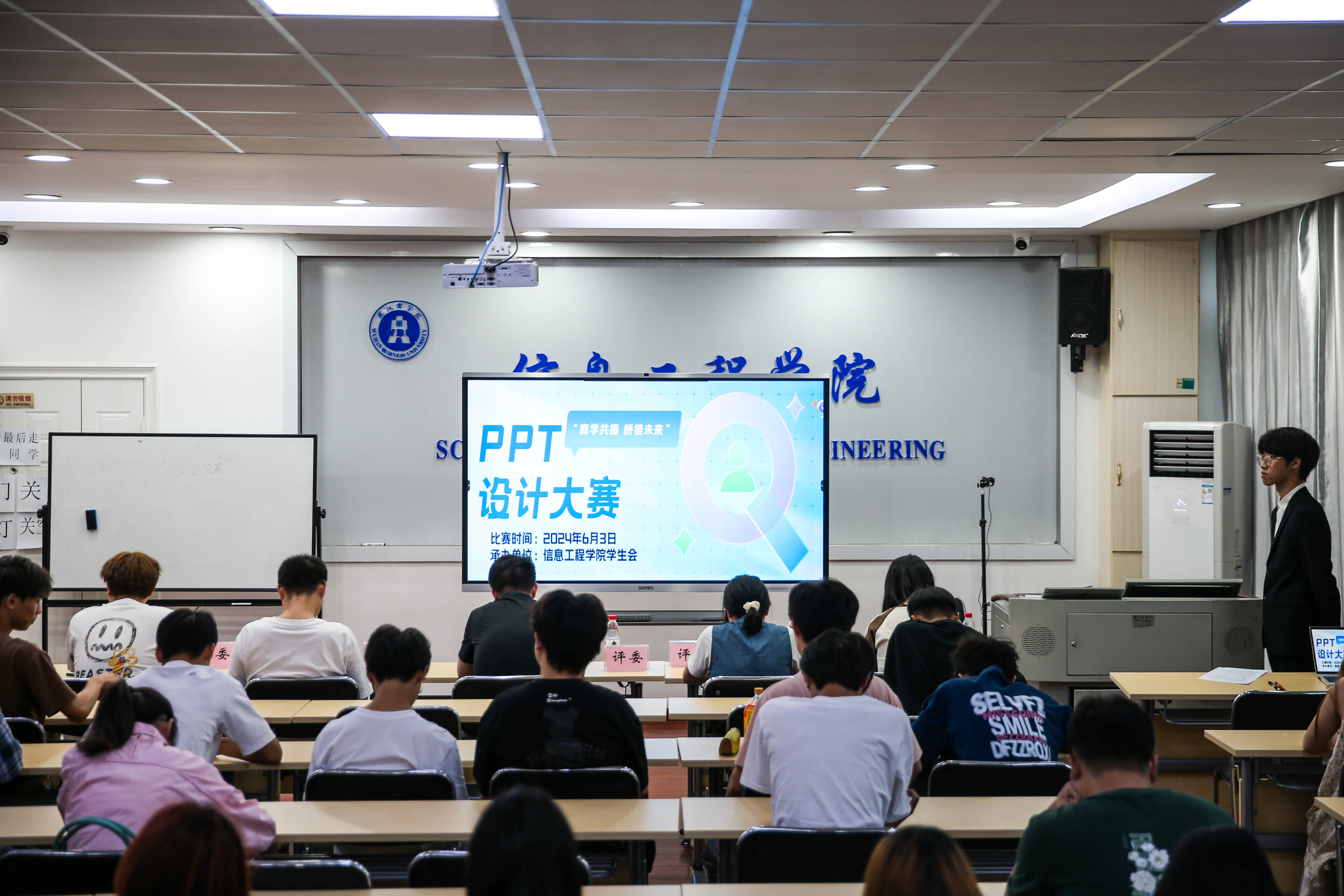 本网讯 为助推学生从实践中学习商道文化,了解校企合作历史,6月3日晚上,信息工程学院于南二401教室成功举办“商学共振 桥接未来”PPT设计大赛决赛。经过初赛的角逐,共有9名来自不同学院的优秀选手成功晋级决赛。软通动力公司项目总监沈俊、人工智能教研室韩晶老师、公共数学教研室胡康老师以及信息工程学院学生代表们担任评委参加活动。