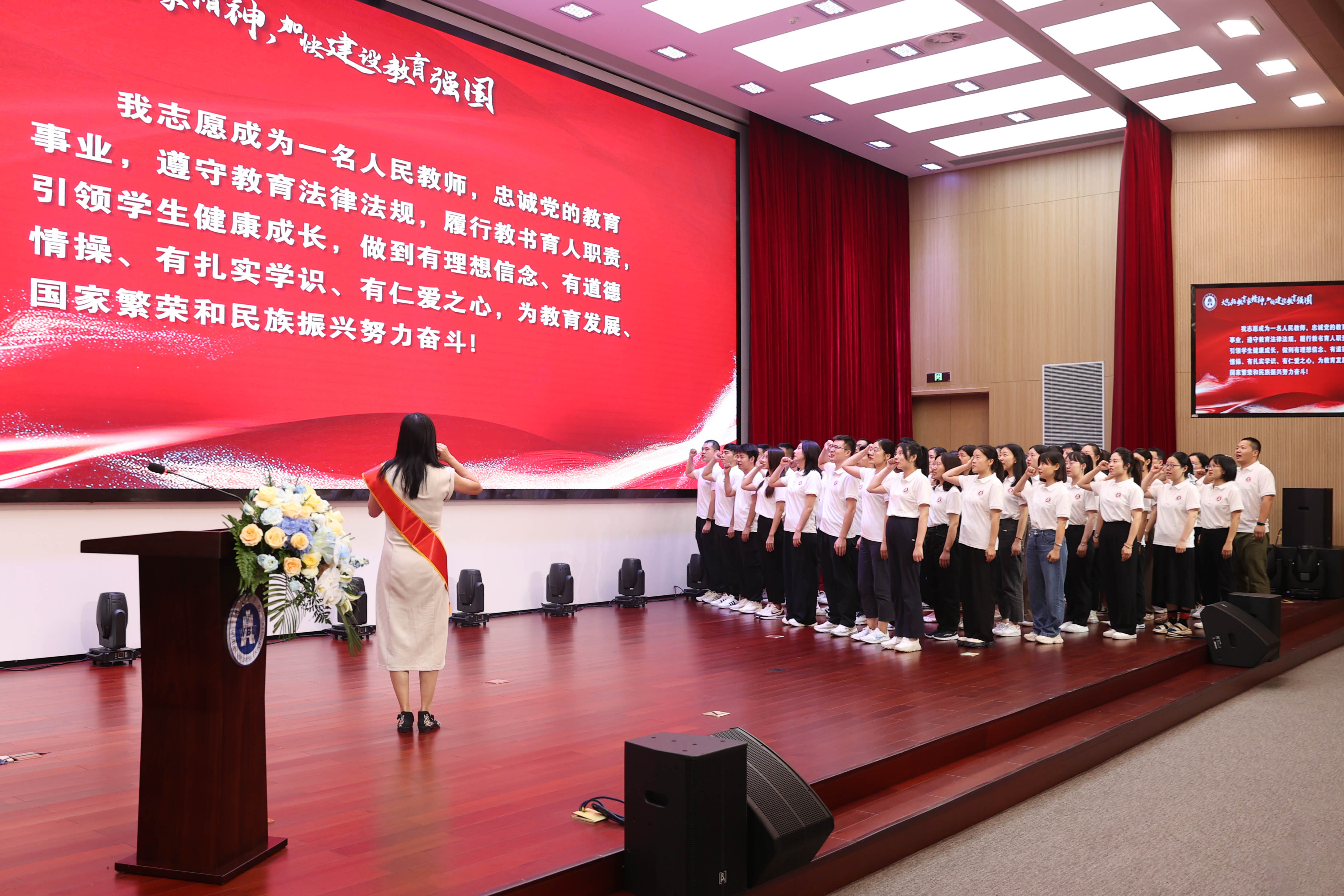 师德楷模刘清带领新进教师入职宣誓,铿锵有力的声音激荡在会场中,新进教师代表胡兰馨饱含热情地说着:“我将牢记习近平总书记和各位前辈们的殷殷嘱托,为培养德智体美劳全面发展的社会主义建设者和接班人为强国建设民族复兴伟业作出新的更大贡献!”