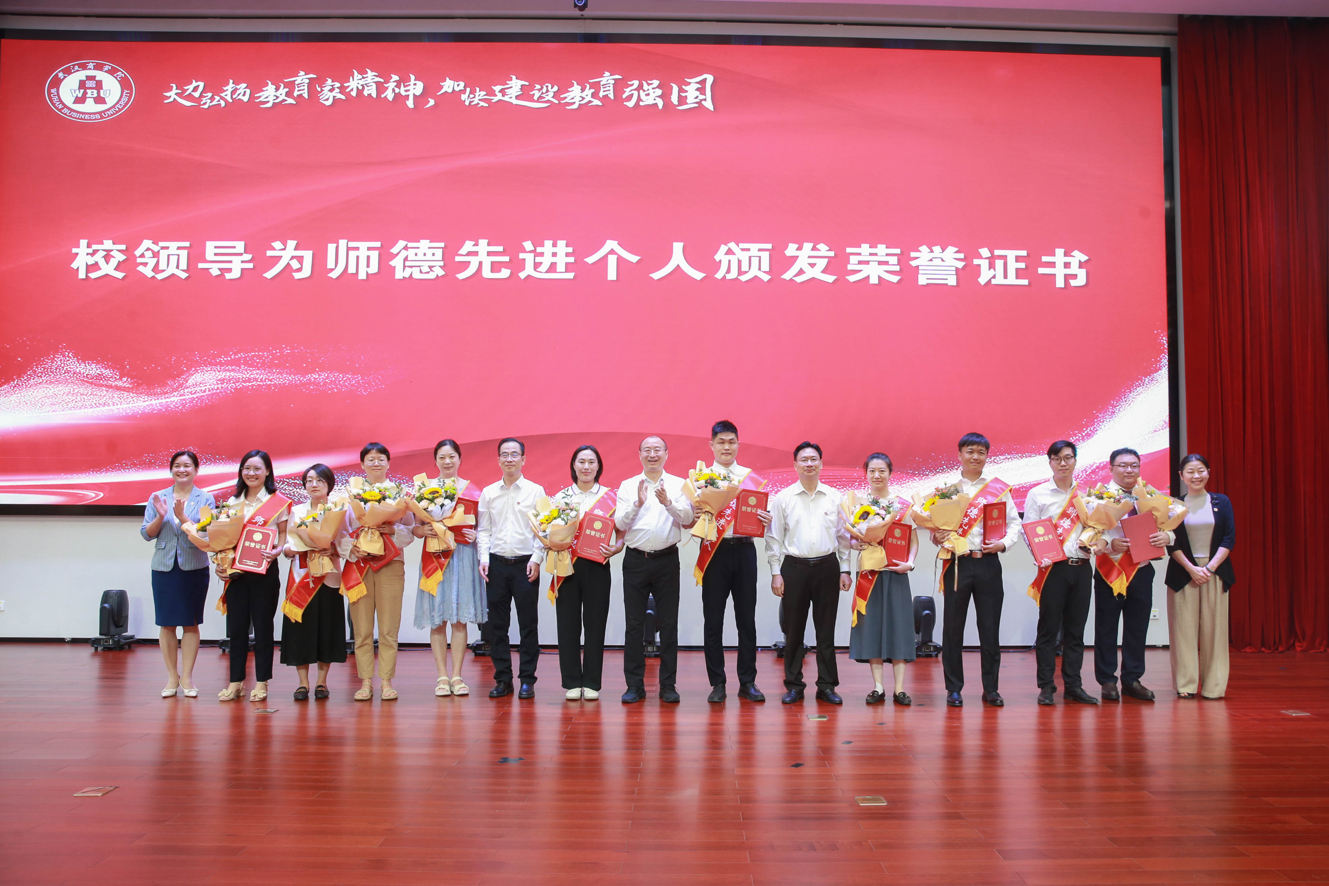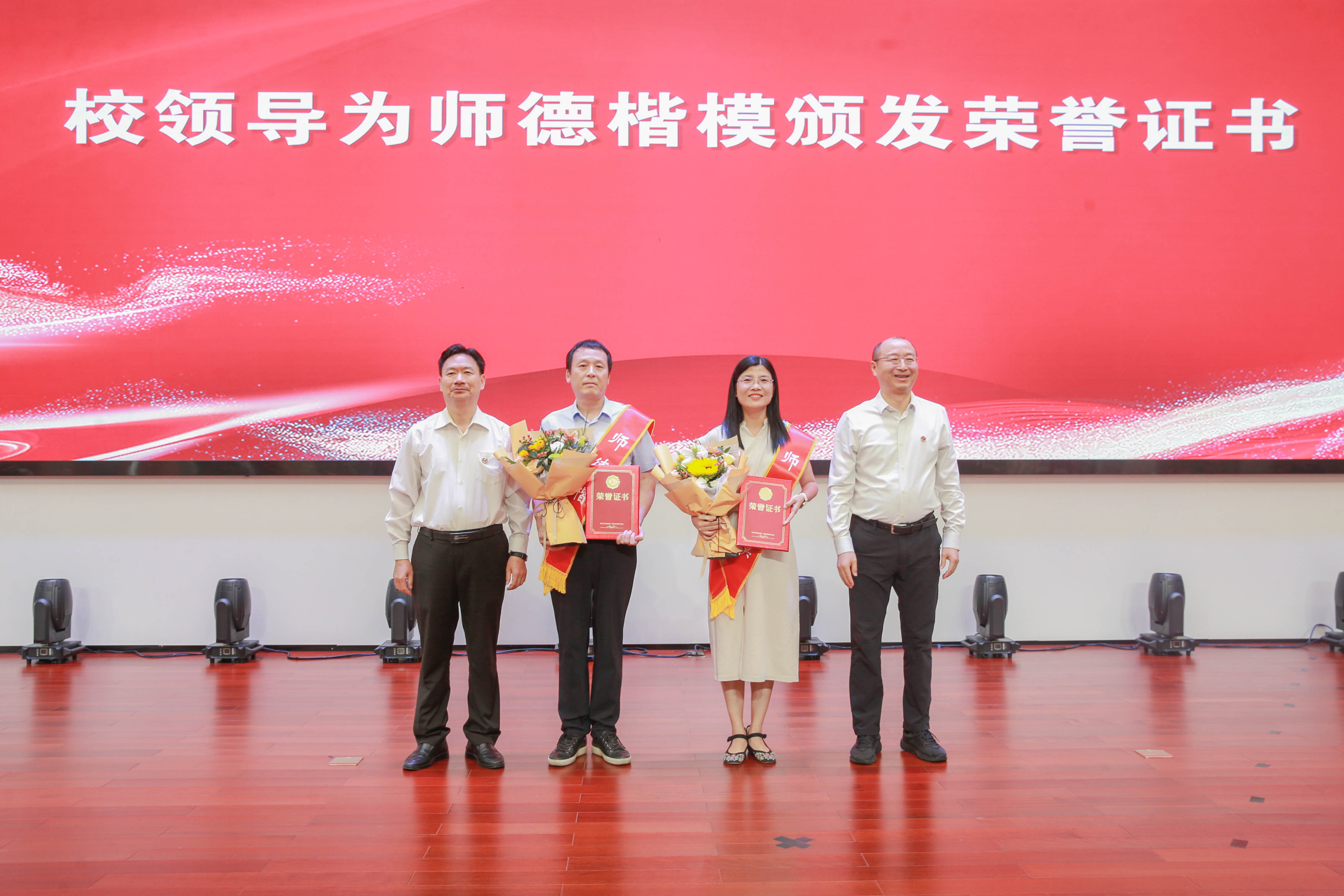 副校长刘佳霓宣读《关于表彰2024年师德楷模、师德先进个人的决定》,党委书记孟武康、校长彭瑜为2024年师德楷模钟爱军、刘清颁发荣誉证书,全体校领导为师德先进个人沈青等十人颁发荣誉证书。师德楷模钟爱军表示,作为人民教师,要把梦想与热情、开拓与创新奉献给祖国和人民,以科学严谨的态度完成本职工作,以实际行动回答习总书记培养什么人、怎样培养人、为谁培养人的时代之问。