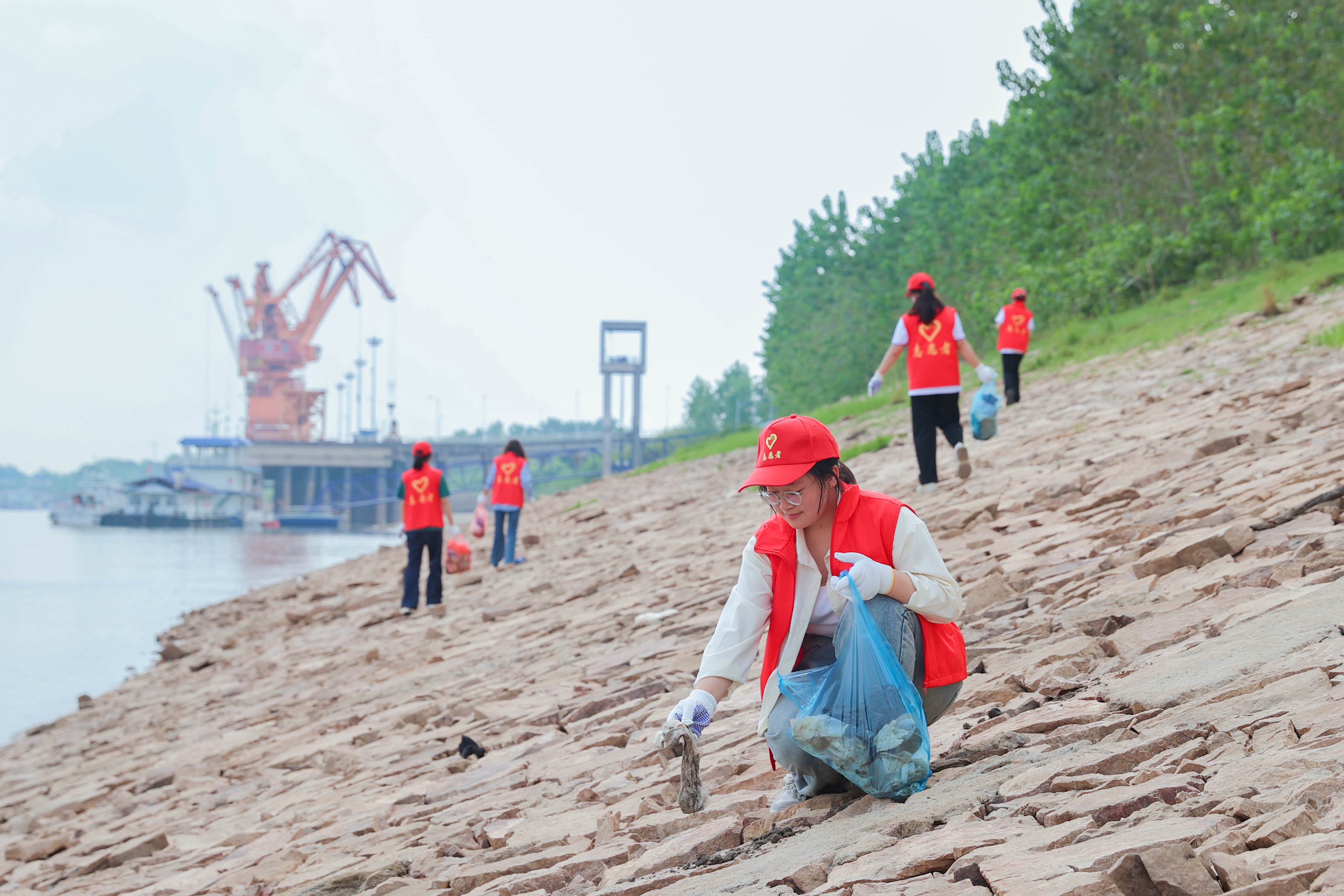 参与师生领取不同颜色的垃圾袋和手套,沿着堤坝进行垃圾分类捡拾。身着红马甲,心似火光,志愿者们地毯式地搜索垃圾。