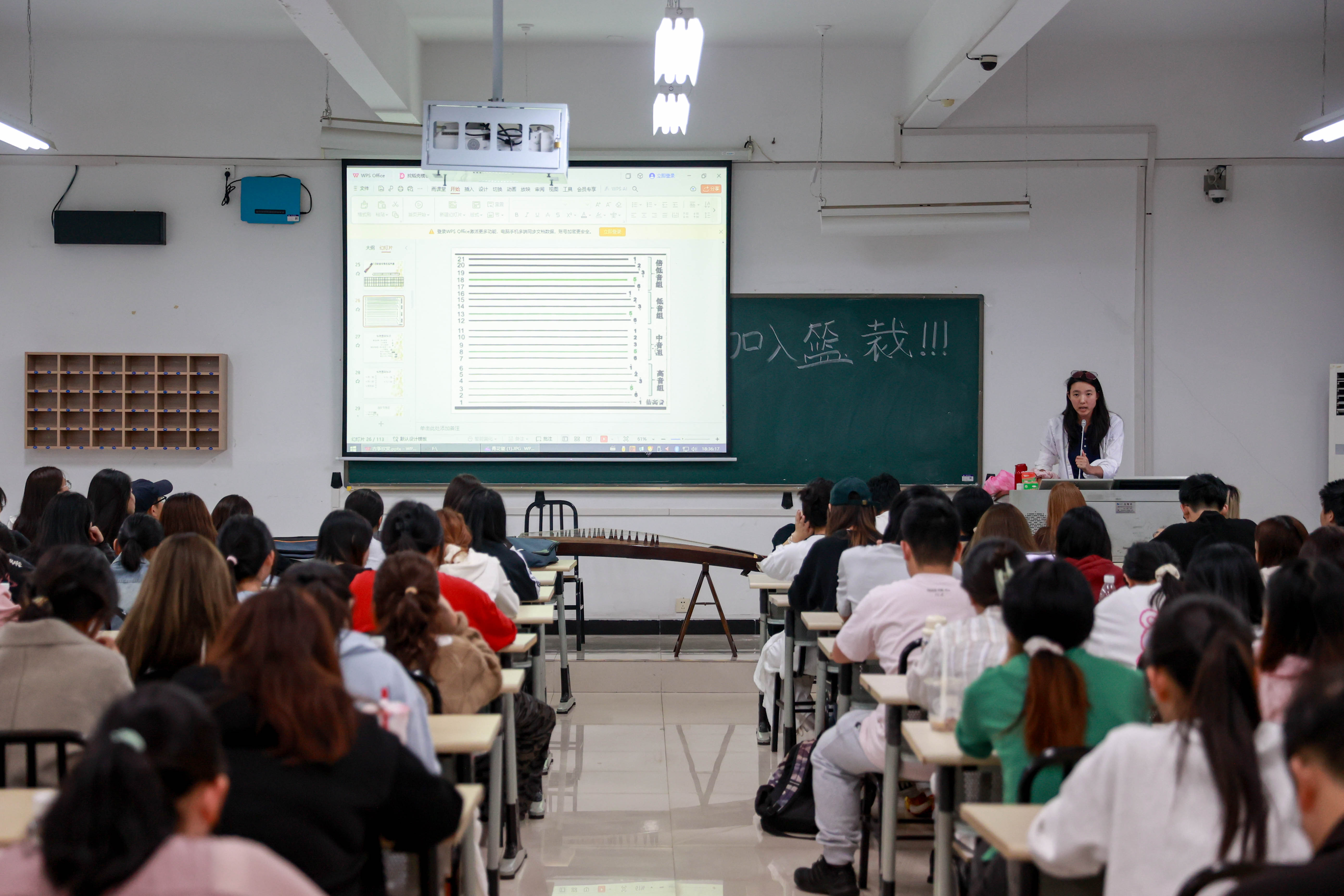 学琴先学史,邓祎琪用了一堂精简的课程向同学们介绍了古筝的由来。古筝,弹拨弦鸣乐器,又名汉筝、秦筝。作为汉民族古老的民族乐器,流行于中国各地。古筝音域宽广,音色优美动听,一弦一音,按五声音阶排列,表现力强,被称为“东方钢琴”。
