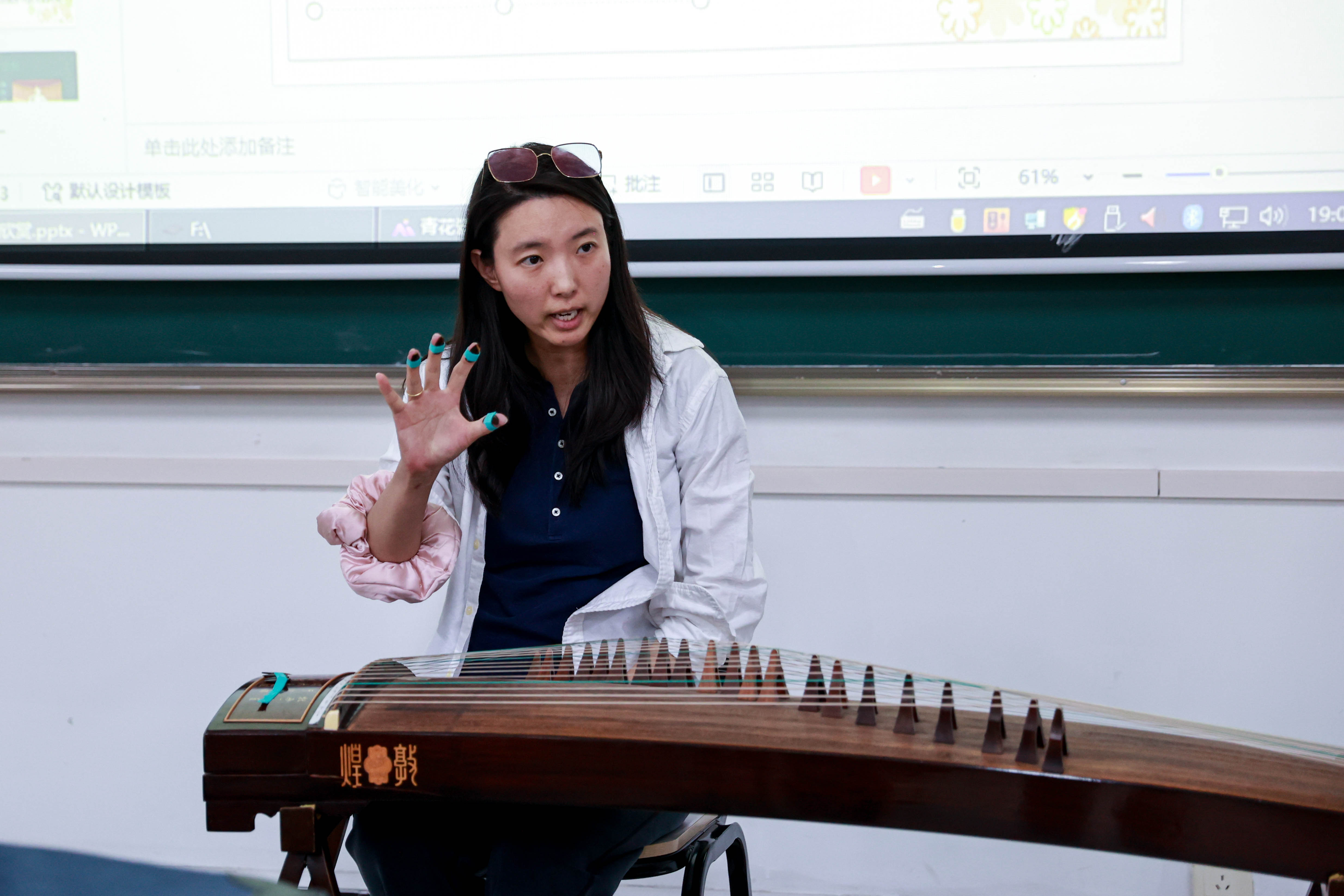 或抹或勾或托,古筝演奏技法多样。各中细则需得“事必躬亲”方可理解领悟,邓祎琪手抚琴弦,清越的乐音断断续续,边奏边讲。选修此课程的学生大多没有乐理基础,想让学生学会,邓祎琪常常一个曲子、一种指法不断的重复。乐音如浪涛一般,在琴弦颤动之间进入了学生心中。