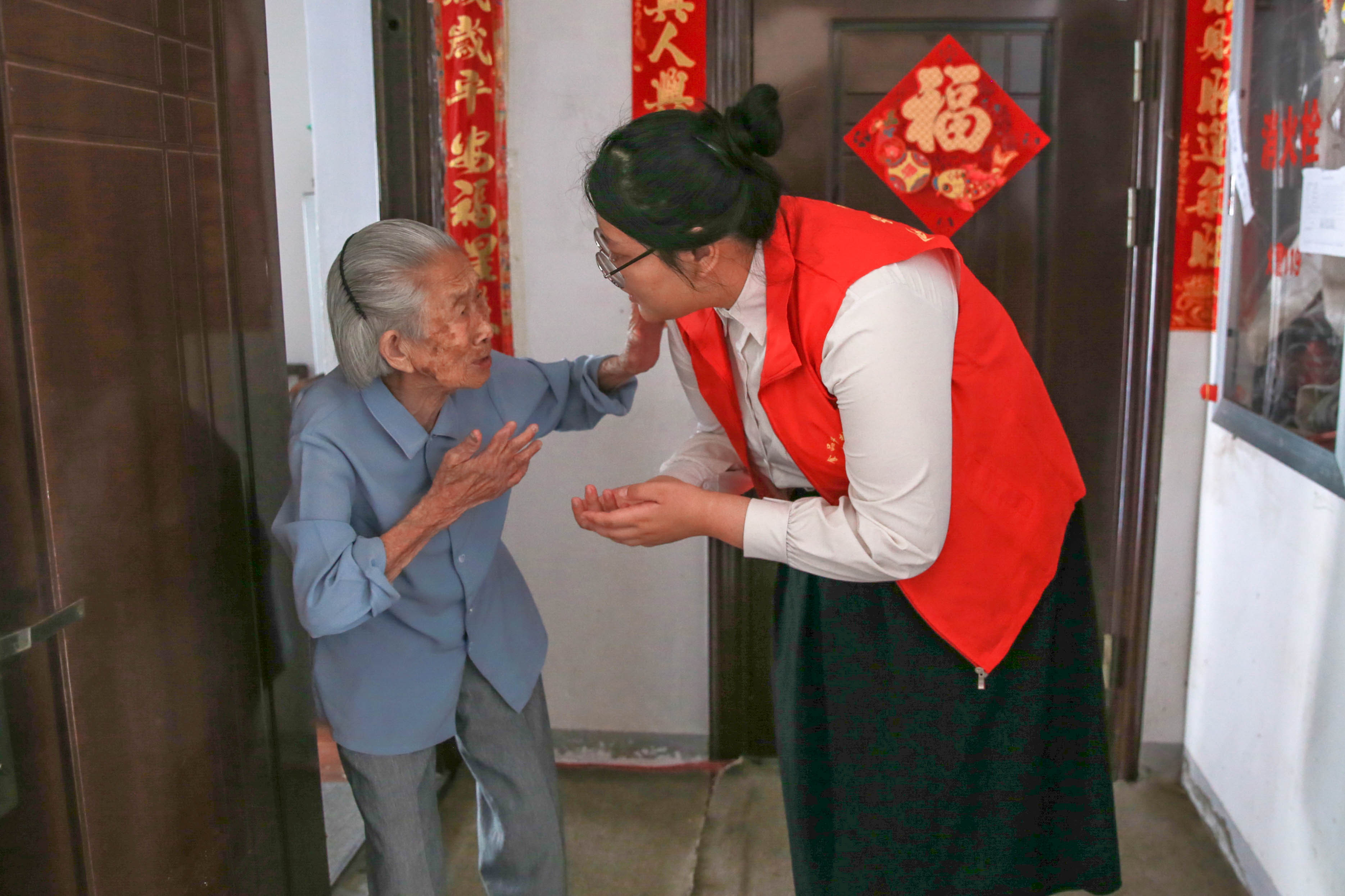 高龄老人与志愿者交流。雷蔻紫摄