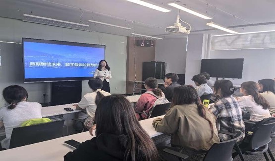 8号的课程安排颇具特色,武汉育知联科技有限公司负责人李竹竹首先带领大家深入了解了企业文化。育知联企业的使命是“以先进的信息技术和创新的人才培养模式,推动产业人才培养与教育进步”;企业的愿景是“帮助就业、协助创业、成就梦想”,致力于打造新商科实践教育的一流平台;企业的理念则强调了“用户至上、诚信专业、务实创新”。同时,同学们也看到了企业优秀的资质,包括高新技术企业证书、5项专利发明、1项外观专利、18项软件著作权证书、1项作品登记证书及6项商标信息,充分展示了企业的实力与底蕴。在会议室,李经理给我们进行了一场“数据驱动未来,数字营销的智慧航向”的讲座。向同学们展示了新技术和新商业融合的现状以及大数据在商业领域的应用,强调了在数字化时代,数据是推动商业决策和创新的关键因素。同时,李经理结合本土周黑鸭品牌智慧门店的案例,与大家展开互动讨论,展示了数据分析在市场营销、产品开发、客户服务等多个领域的应用。让同学们对数据驱动有了更直观的认识。此外,讲座中还让大家见识了数字人短视频营销新赛道的开阔前景。