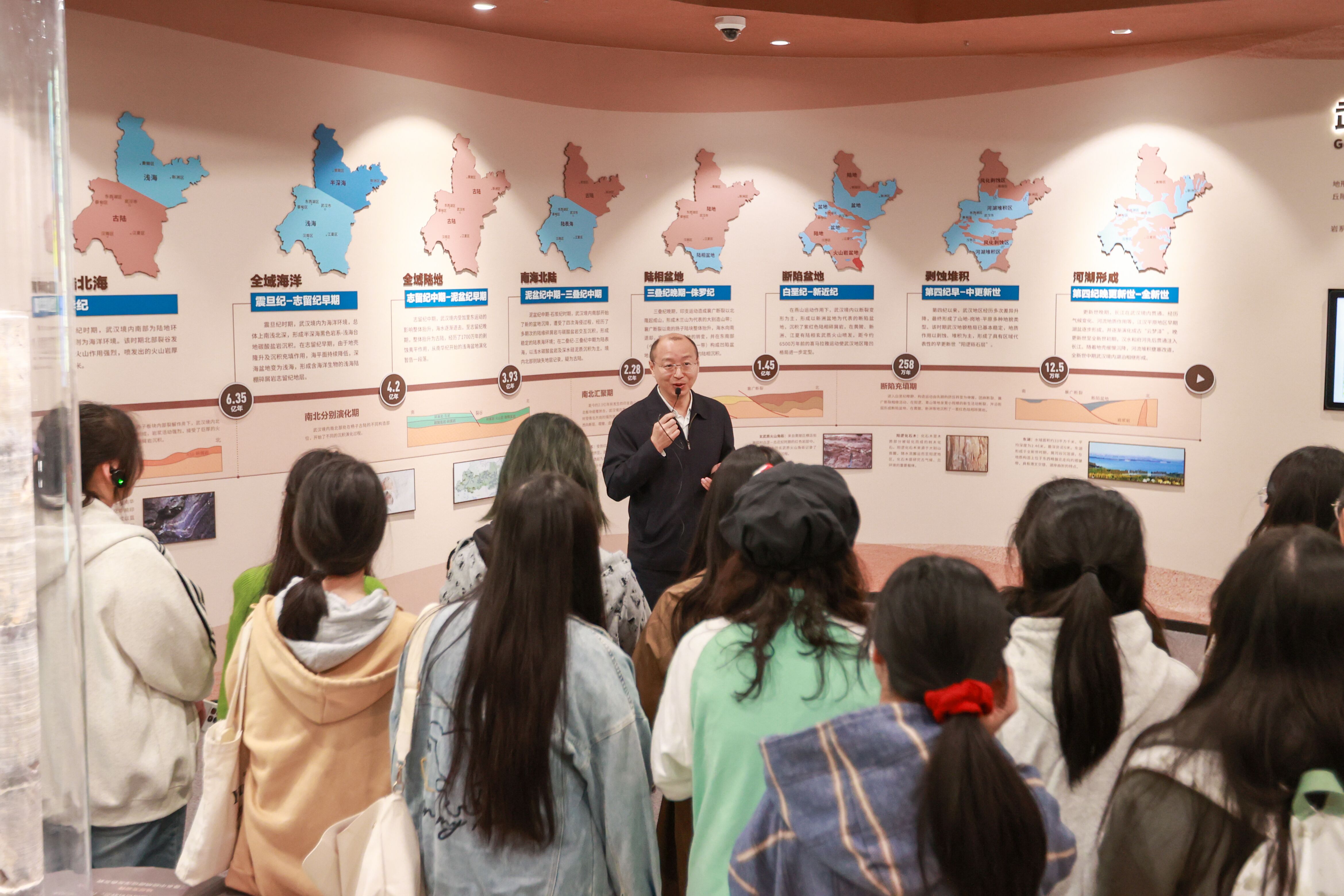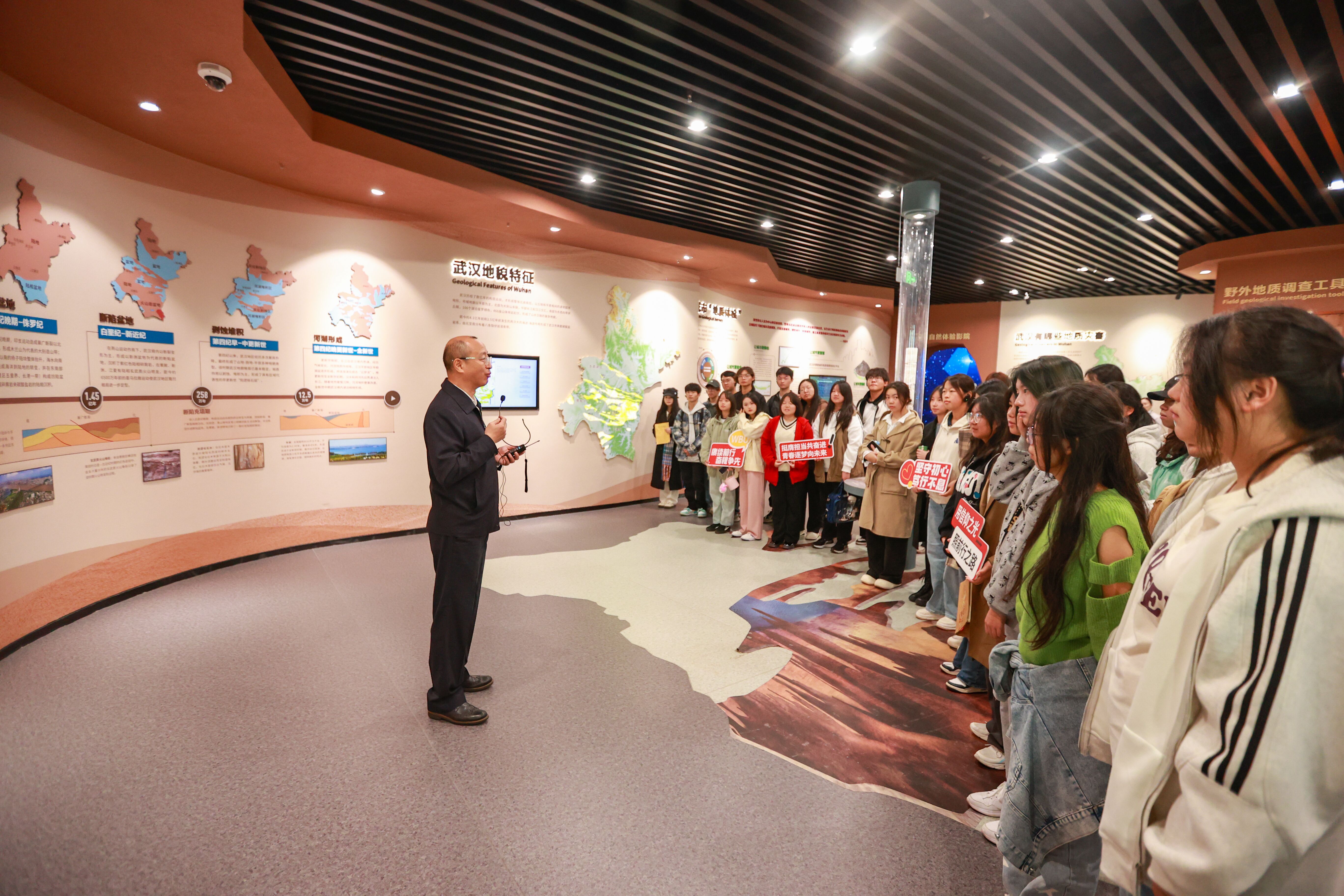 在武汉城市地址科普展前,孟武康为同学们解密武汉的“前世今生”。孟武康介绍,武汉,九省通衢的武汉历来是全国商业重镇,商贸繁盛,成为“楚中第一繁盛之处”。近代的武汉,是仅次于上海的第二大金融中心、工商业都会和通商口岸,曾一度是中国革命的领导中心。如今,英雄城市武汉,是建设中的国家中心城市和长江经济带核心城市,是发展能级跃升的超大城市,正扎实推进具有全国影响力的科技创新中心建设,发展迎来新的重大战略机遇。“现在我们常说,大江大湖大武汉,重塑新时代武汉之重。在新的历史坐标下,武汉之‘大’、武汉之‘重’,有什么新的内涵?”孟武康向同学们抛出问题,希望同学们在参观的过程中了解武汉、爱上武汉,找到属于自己的答案,作为新时代大学生,乘武汉发展之势,以革命文化锻造意志品质,以社会主义先进文化开拓视野增长才干,培育高尚品格和健全人格,努力成为担当民族复兴重任的时代新人。