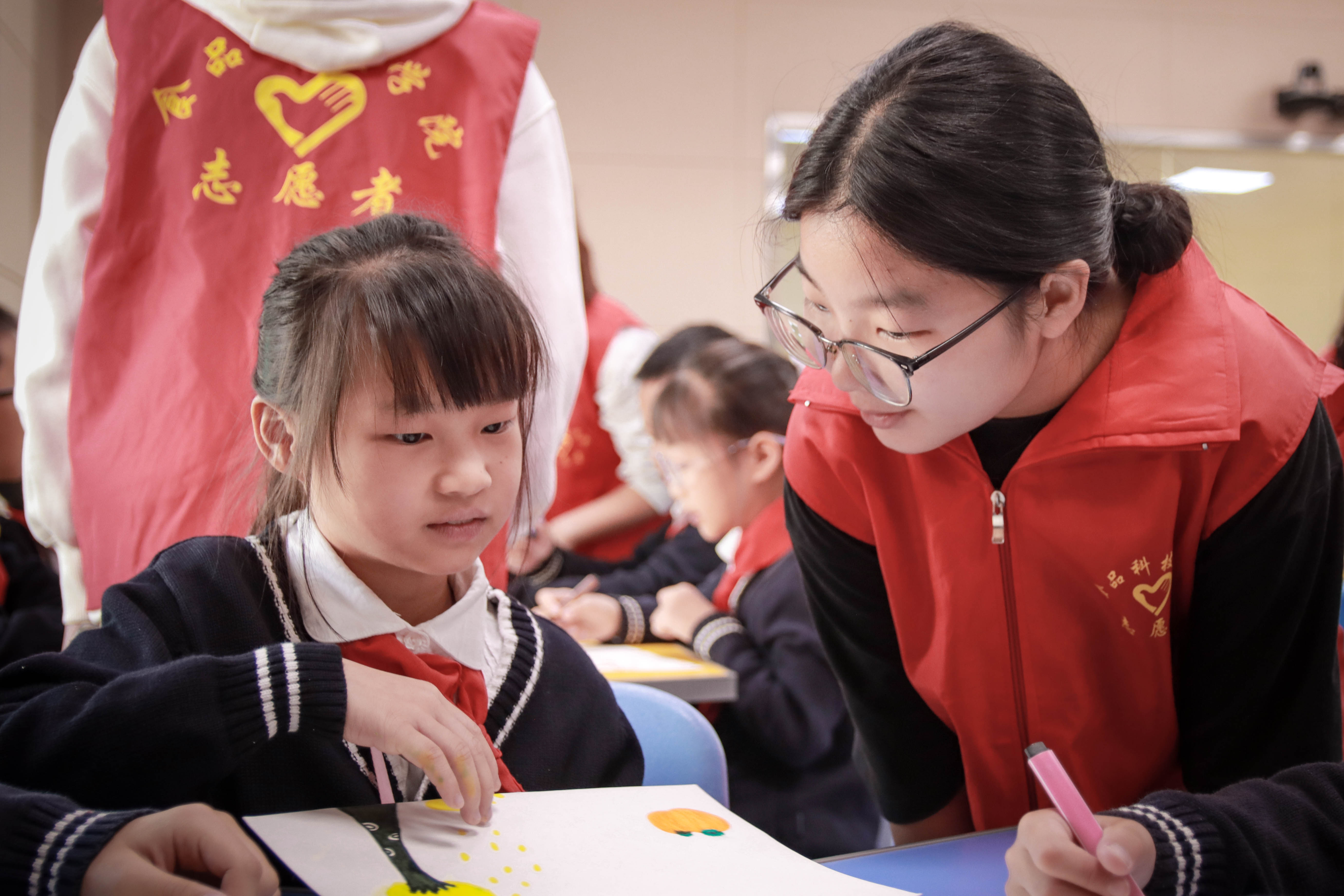 学生志愿者带领小朋友绘画。王文茜 张荣轩摄