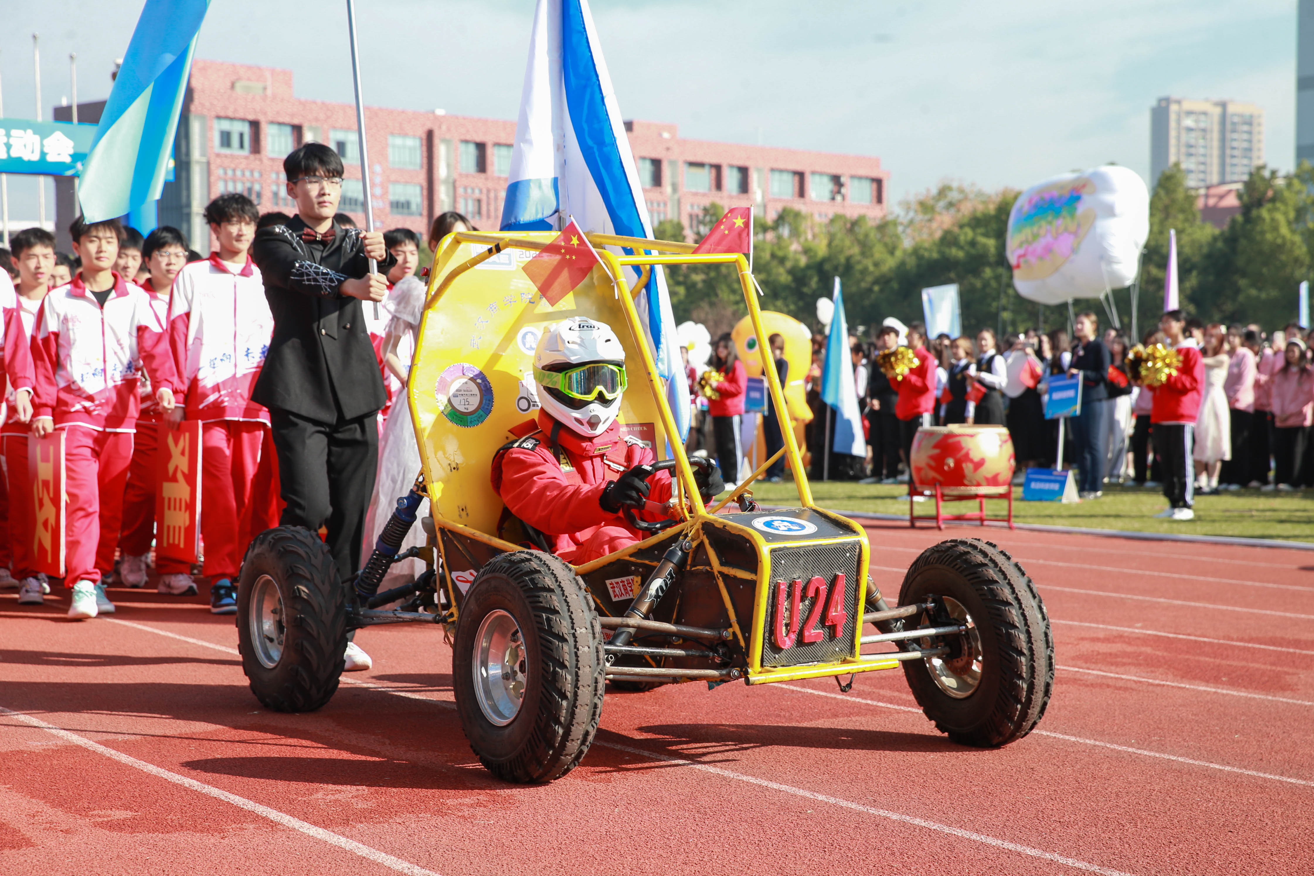 紧接着,机电工程学院雷霆车队震撼登场。赛车手身着红色赛车服,精神饱满,眼神坚定。头戴安全头盔,骑着炫酷的小型越野车,在跑道上形成了一道亮丽的风景线。