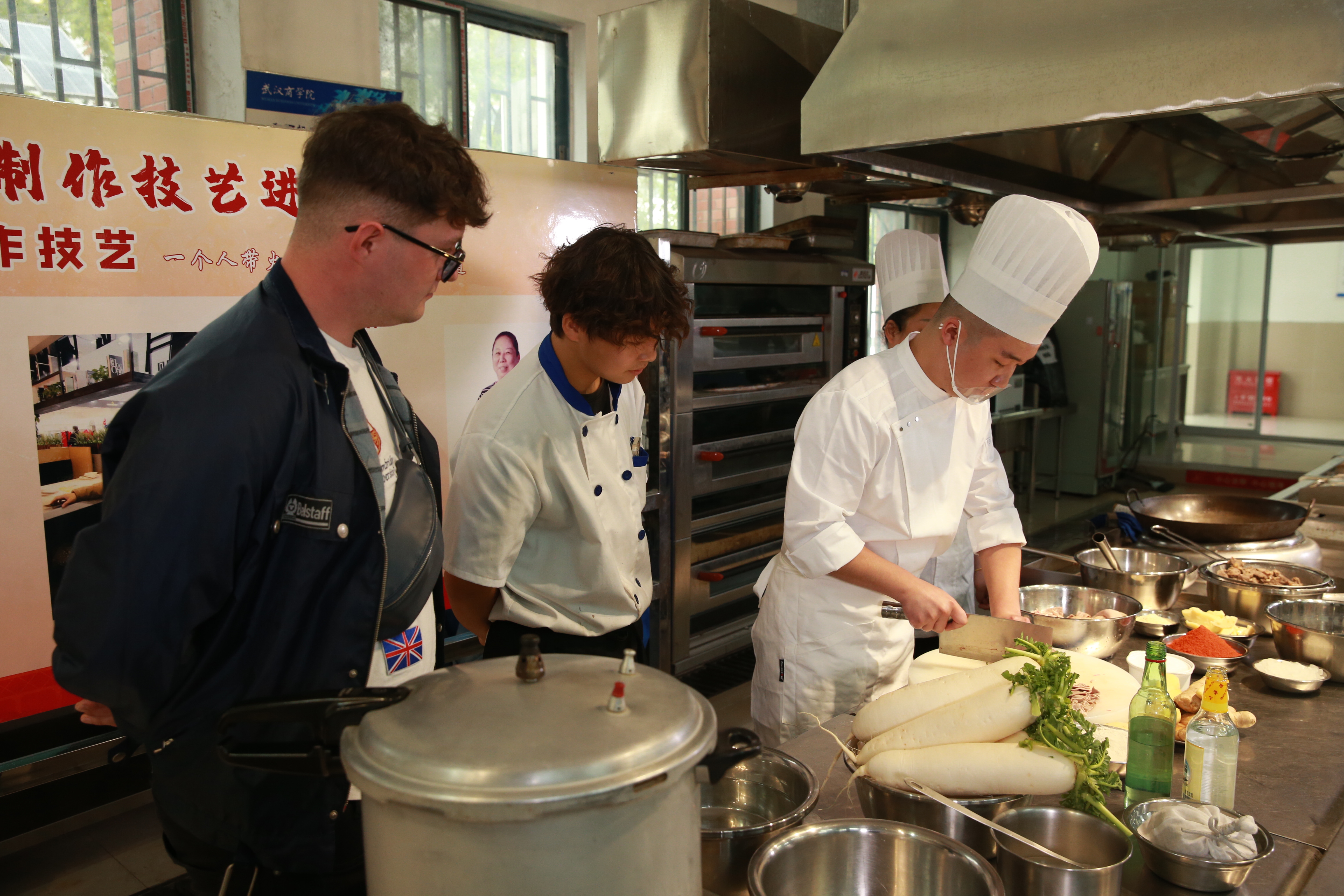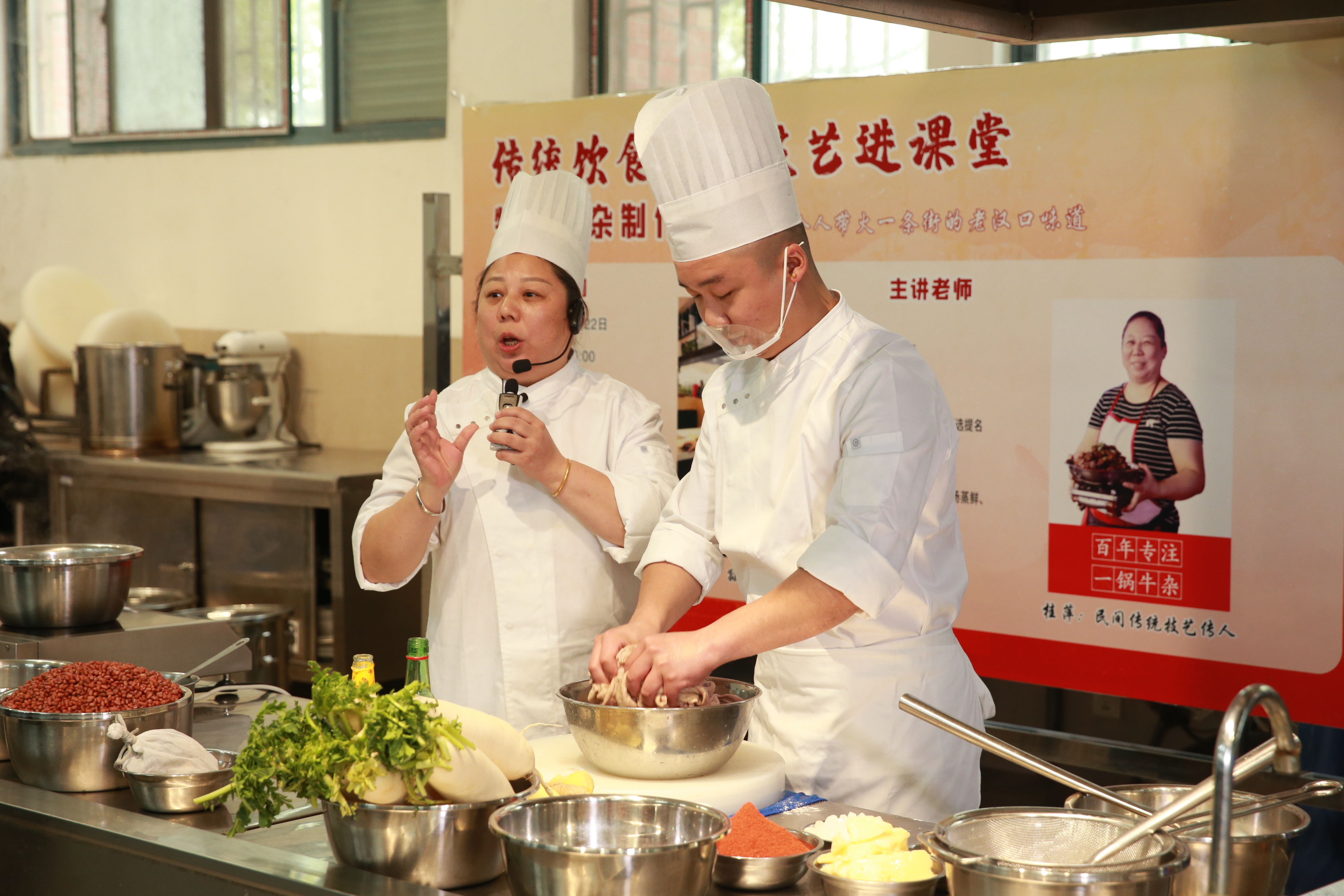 本网讯 长堤街口牛杂香,汉口江滩武汉味。10月22日下午,促进传统饮食制作技艺进课堂,我校于南一投六举办桂萍牛杂制作工艺分享会,由我校1988级毕业生孙炼携桂平牛杂第三代传人桂萍进行授课,现场邀请了多名外国友人品尝点评。