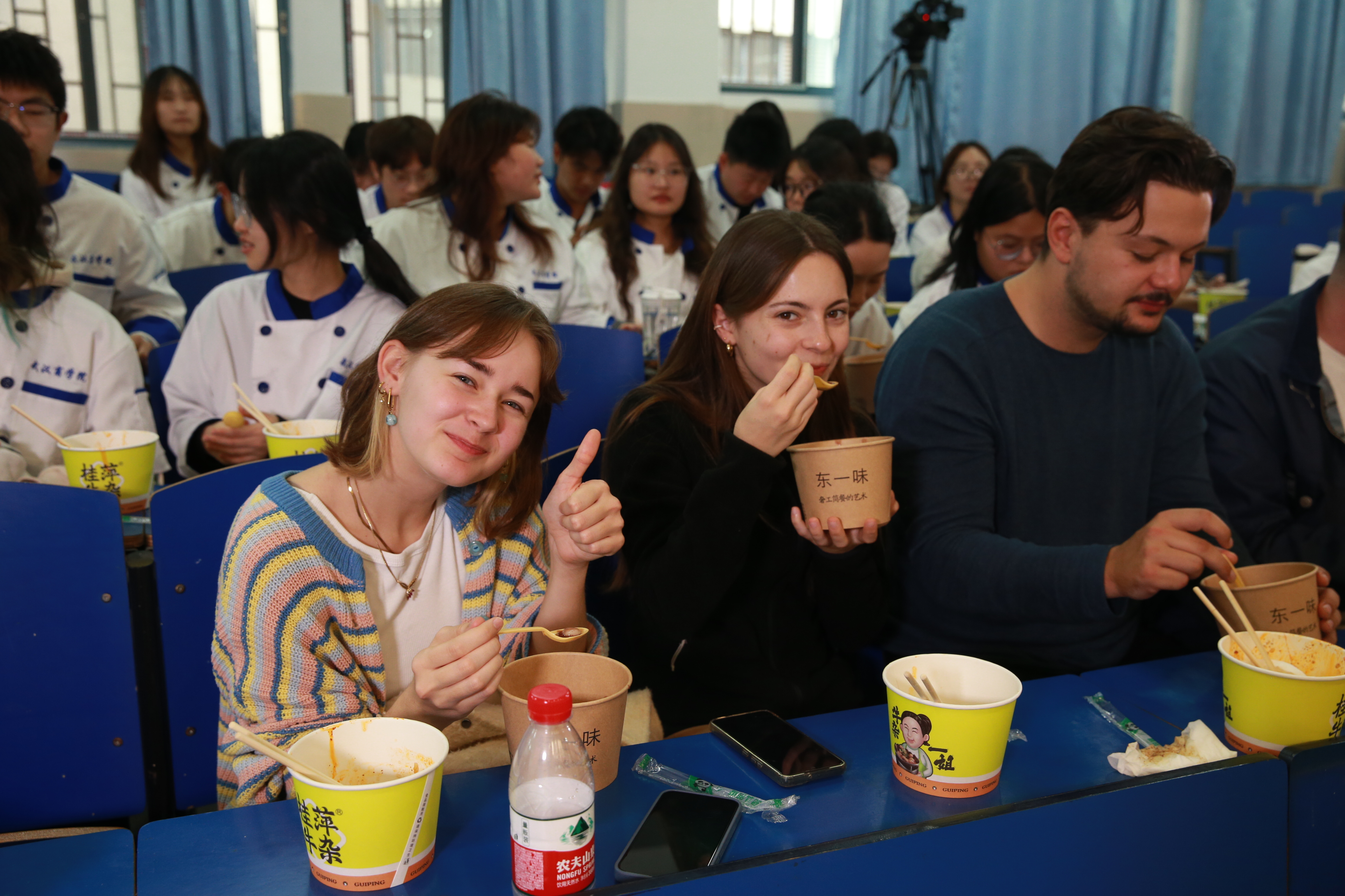现场火候已经到了,只听牛杂在锅中翻腾,兹拉作响,便是要到起锅的时候。在牛杂出锅时,孙炼邀请了台下一位外国友人与学子一同上台见证牛杂由腥膻到香辣的转换。