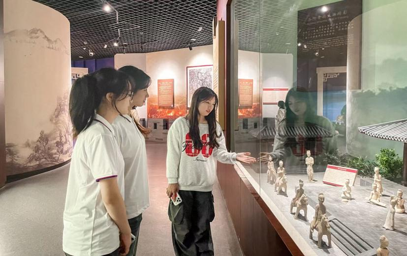 10月19日下午,团队到达研学的第三站——岳阳博物馆。作为国家二级博物馆,岳阳博物馆内的展览内容丰富多样。其中,“洞庭长歌——岳阳古代文明展”从春秋时期工艺的春秋愠儿青铜盏到战国带铭文蟾蜍纹方钮铜铎,展现了岳阳悠久的历史。“岳阳民俗文化展”展出了四百多件民俗文物和民间艺术品,精美的雕花床、色彩斑斓的刺绣、古朴的农具等,都是岳阳灿烂文明的见证,是湘北民俗文化的物质体现。此外,“雷锋的故事——手绘连环画作品展”也为学生们带来了别样的精神洗礼。参观过程中,学生们对岳阳博物馆的展览赞不绝口。团队成员谢欣怡兴奋地说:“那个春秋愠儿青铜盏,工艺真的太精湛了,很难想象古人在那么久远的年代就能制作出如此精美的器物。” 徐海洋也迫不及待地接着说:“民俗文化展也让我大开眼界。我最喜欢的是一幅刺绣作品,上面的图案栩栩如生。在这里,我们不仅可以了解到岳阳的历史变迁,还能深刻感受到长江文化对这片土地的深远影响。”