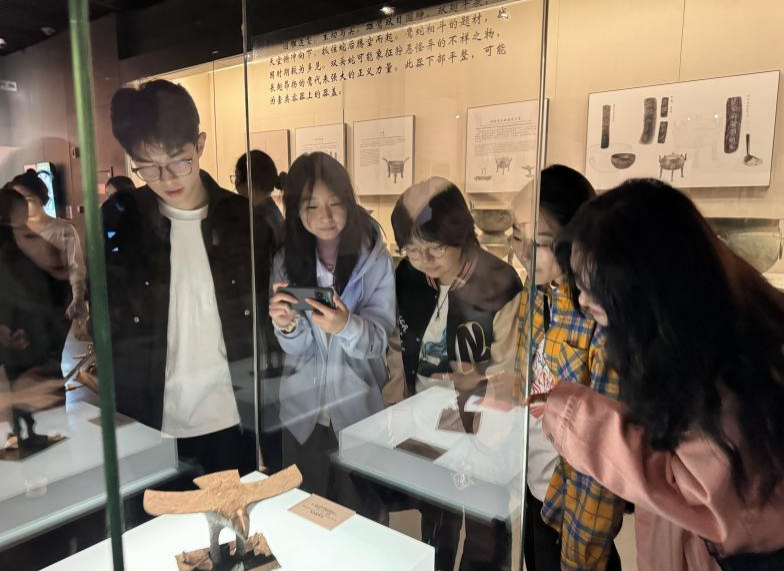 在安徽博物院青铜展示厅中,一尊造型稳重古朴、雄浑大气的鼎吸引了同学们的注意。“这尊铸客大鼎是安徽博物院的镇馆之宝之一,1933年出土于安徽寿县李三孤堆楚幽王墓,为研究楚文化提供了宝贵的实物资料,其铭文内容也为研究战国时期各国铸铜作坊的工匠流通情况及其管理制度提供了依据。”安徽博物院的讲解员说。安徽特殊的地理位置,使其成为南北文化交汇的集中区域,这里既能看到中原文化礼制影响下,长江南岸青铜礼器的铸造使用,又能在长江北岸发现具有南方特色的器物。商周时期,安徽作为中原和南方诸国的过渡地带,是文化交流的重要枢纽。