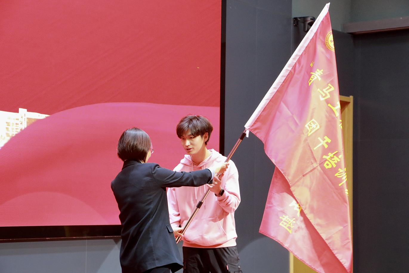 马克思主义学院党委书记陈丽为第35期“青马工程”团干培训班代表授旗 高奕涵摄