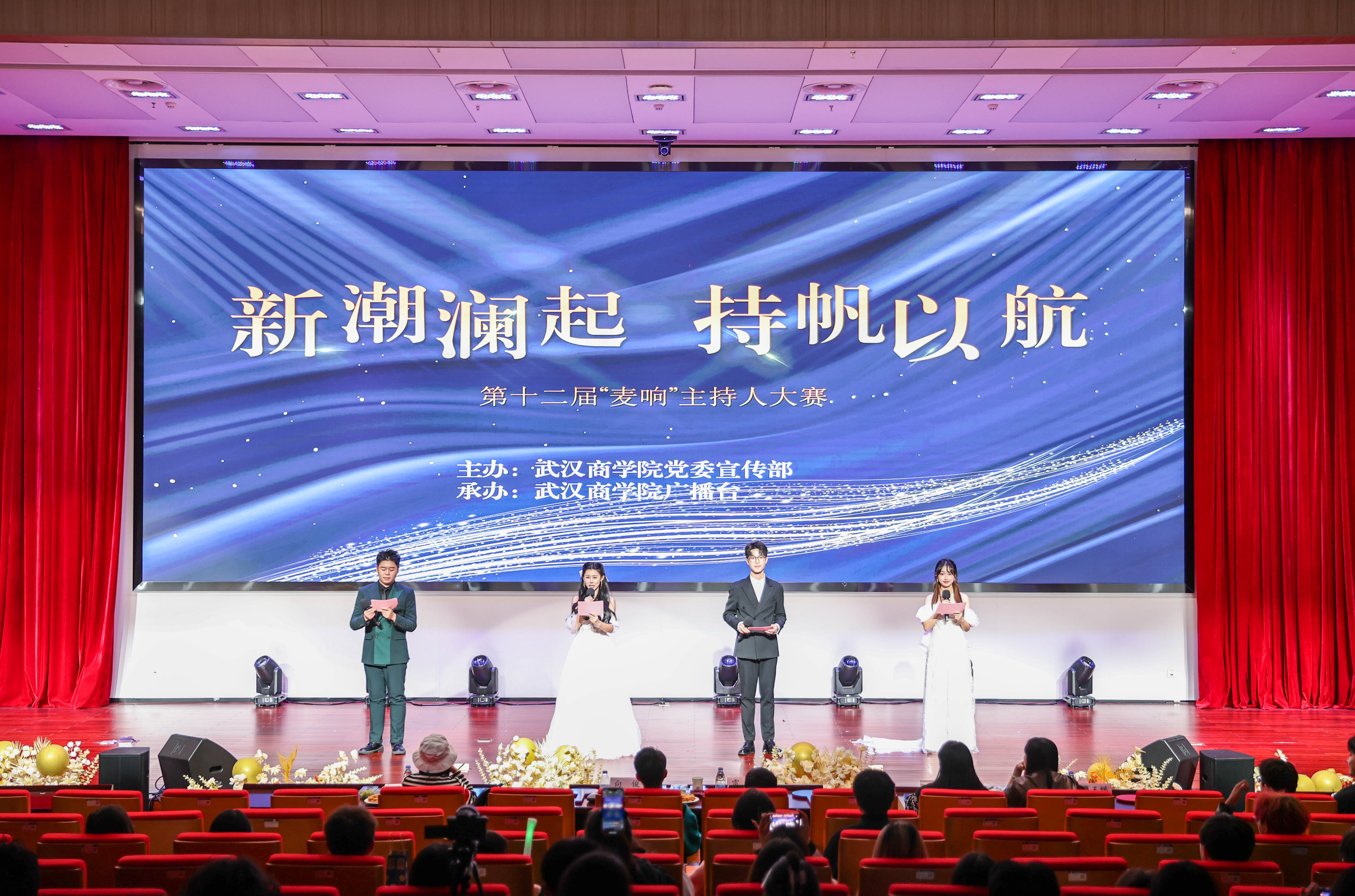 本网讯 11月11日晚,夜幕降临,聚光灯缓缓亮起,南区大学生中心摇身一变,成为了闪耀着梦想光芒的舞台,万众瞩目的第十二届“麦响”主持人大赛璀璨启幕。此次大赛以“新潮澜起,持帆以航”为主题,由我校党委宣传部主办,广播台承办。通过官方抖音平台实时直播,跨越时空的界限,展示这场视听与智慧的双重盛宴。