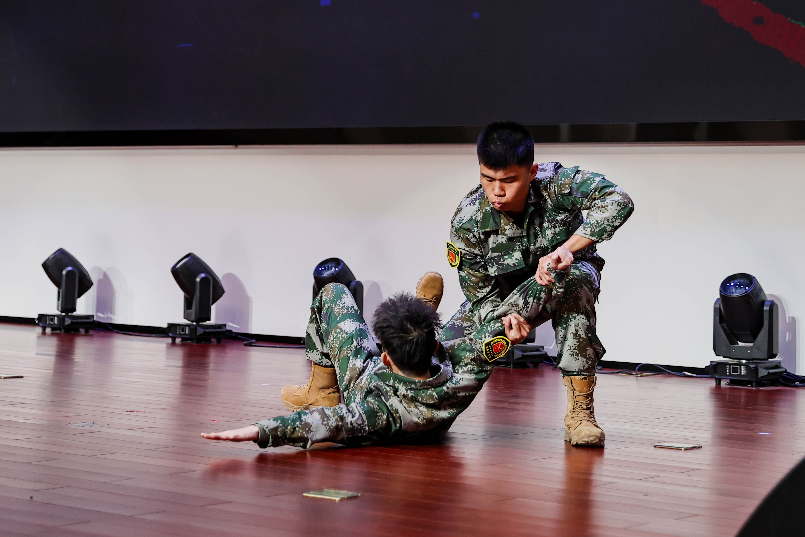 国旗护卫队现场带来队列展示,举手投足间整齐划一。退役复学大学生团队为同学们带来了一场热血沸腾的擒敌对抗展示。勇士们以矫健的身姿、精妙的策略展开激烈角逐,一招一式间气贯长虹,场上掌声经久不息。